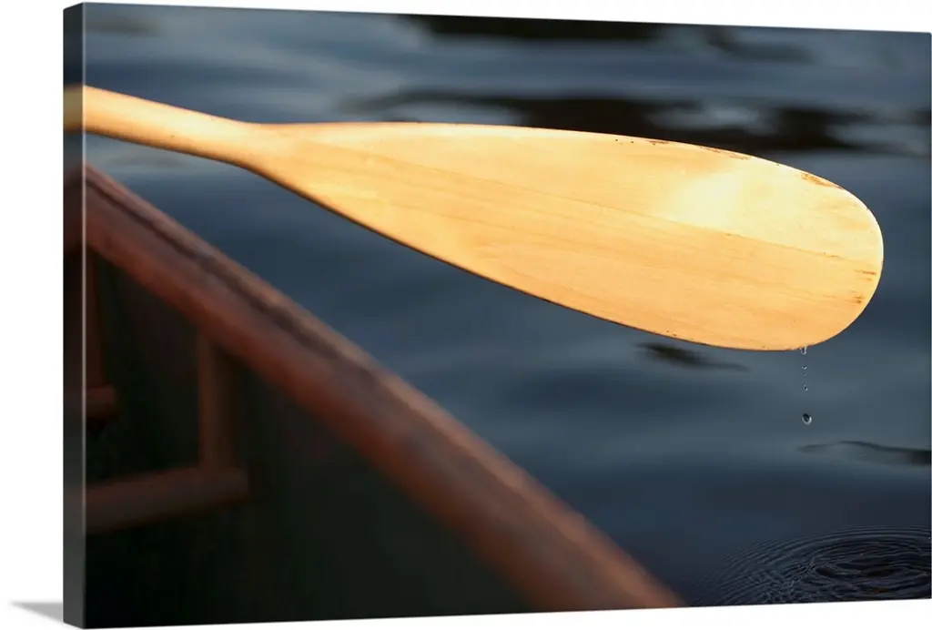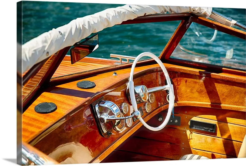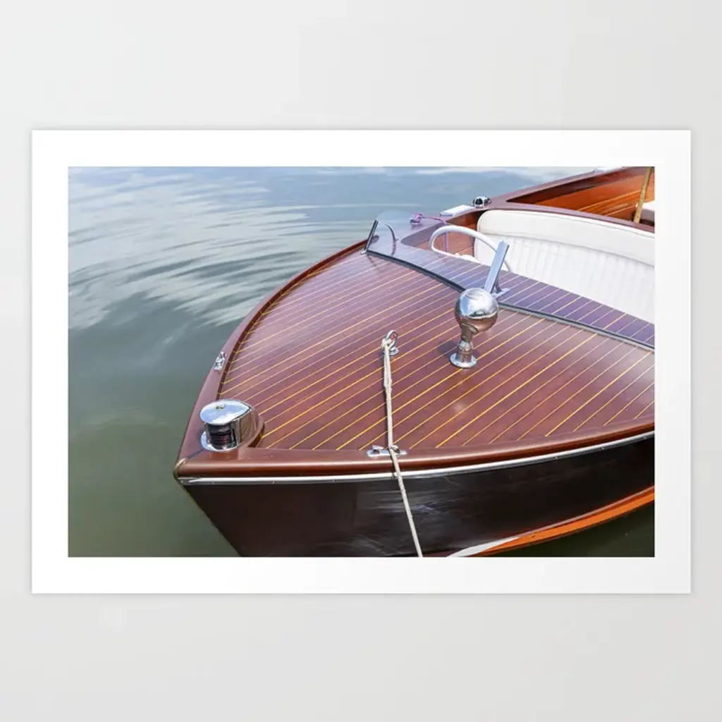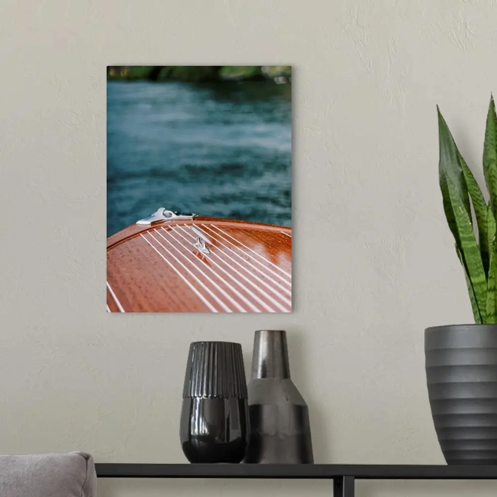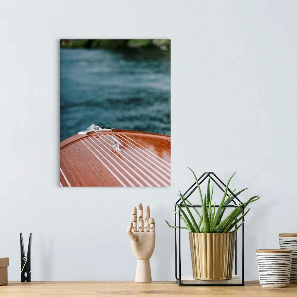 A photograph of the bow of a beautiful wooden motorboat on the water.