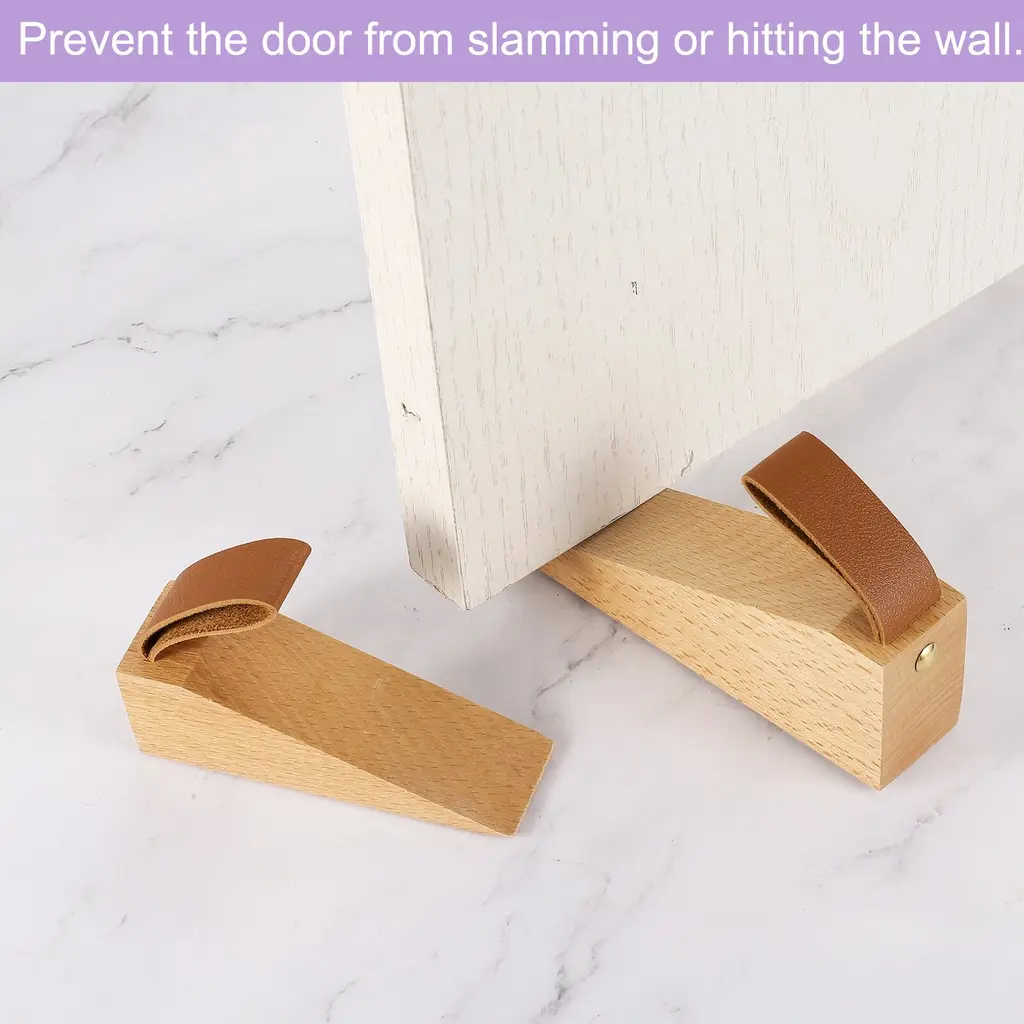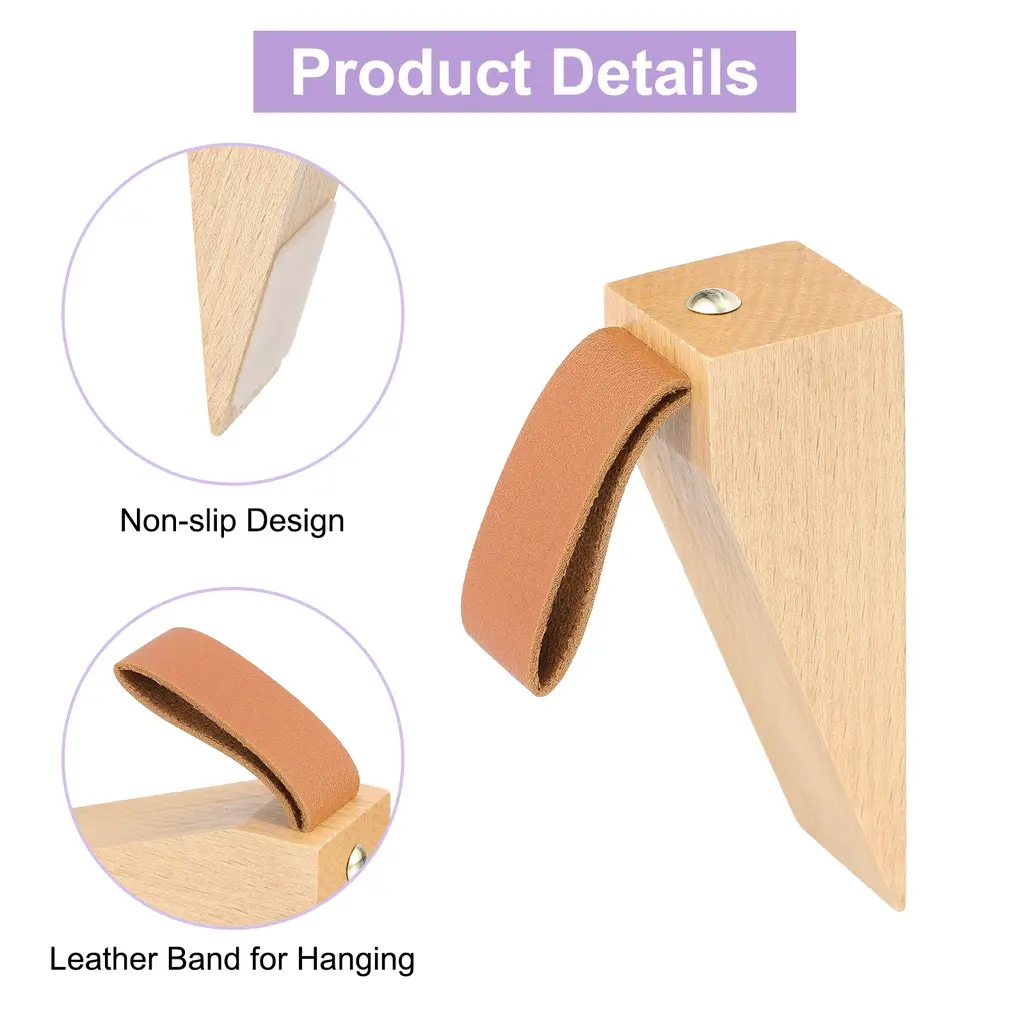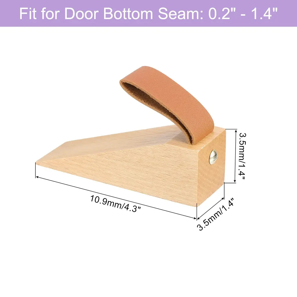 Material - The non-slip door wedges are made of wood with beautiful wood grain, a comfortable and soft feel, easy to clean, and very durable. Suitable for vintage design, and rustic style.Design - The smart wooden door stopper has a widened non-slip base, which increases the friction between this door stopper and the floor, making it difficult to slide. In addition, it has a leather band for hanging on the door handle when not in use.Feature - The wood door wedge can effectively prevent slipping, prevent the door from slamming or hitting the surface of wall, avoid noise and wall loss, and protect you from being stuck or knocked by the door.Wide Application - Suitable for all kinds of floors, such as wooden floors, linoleum floors, carpets, tile floors, concrete floors, etc. Also suitable for all kinds of doors, wooden doors, glass doors, iron doors, etc. It is a great decoration for your house, cottage, hotel, office, or bedroom.Specification:Material: WoodSize: 4.3 x 1.4 x 1.4 inch / 10.9 x 3.5 x 3.5 cm (L x W x H)Fit for Door Bottom Seam: 0.5-3.56 cm / 0.2 - 1.4 inchPackage: 1Pcs x Wood Door Stopper