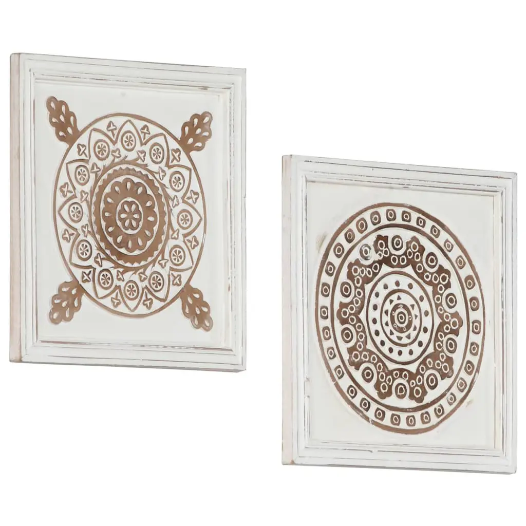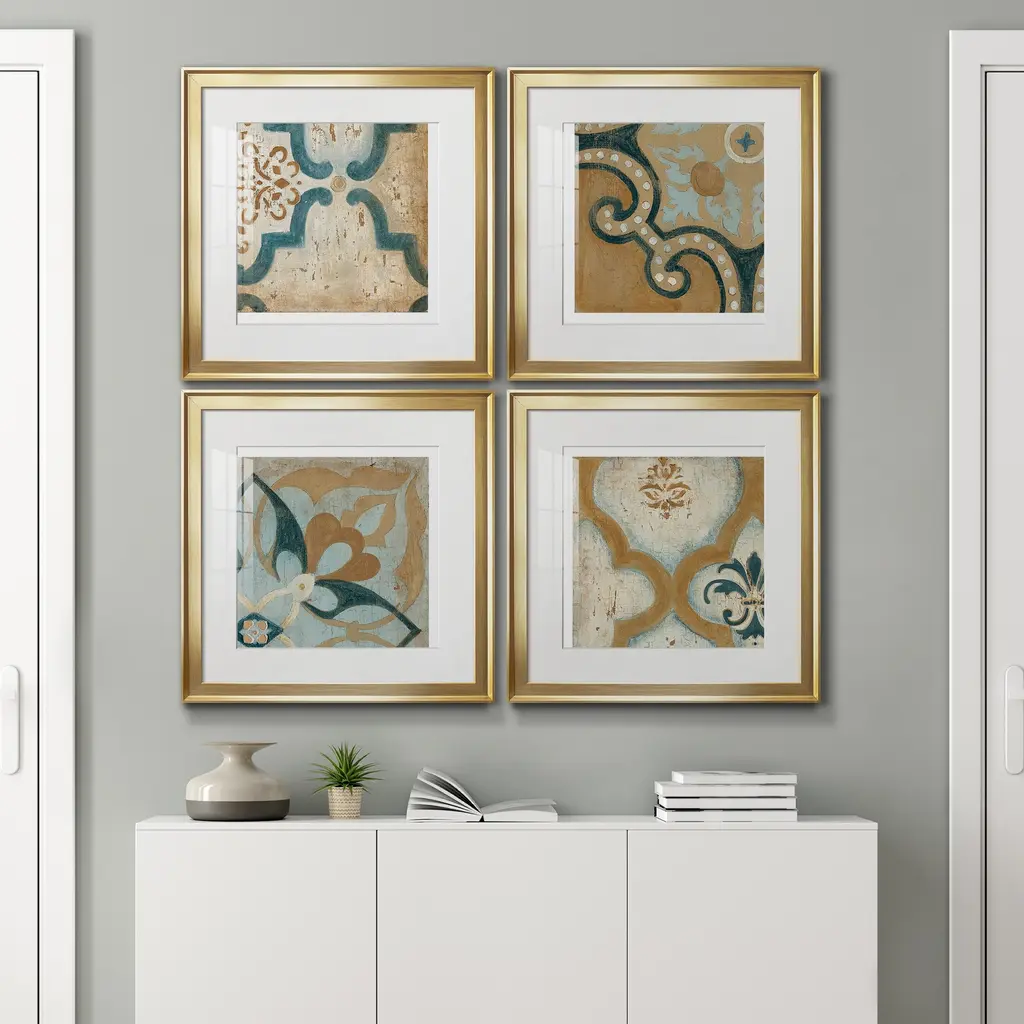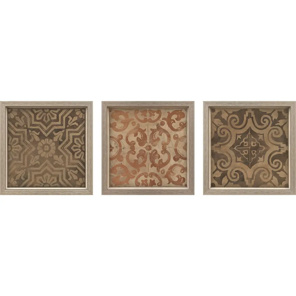 Traditional geometric designs display a floral motif creating an intricate visual offering. They are framed in a medium wood-grain finish molding.
