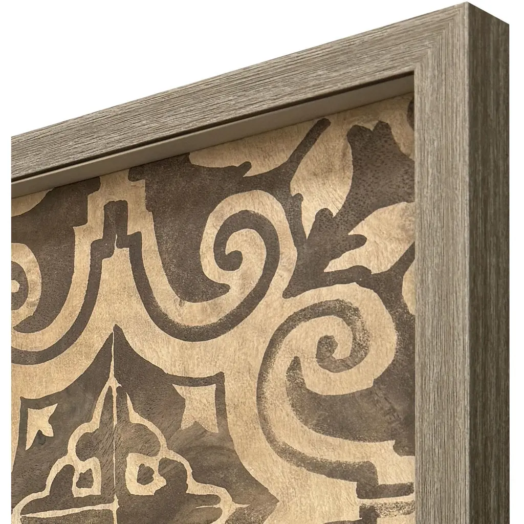 Traditional geometric designs display a floral motif creating an intricate visual offering. They are framed in a medium wood-grain finish molding.