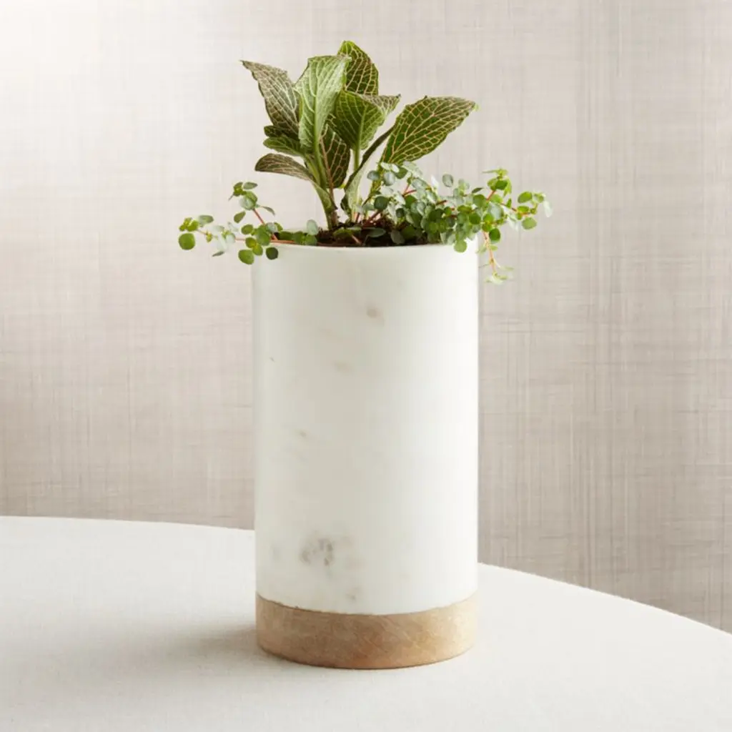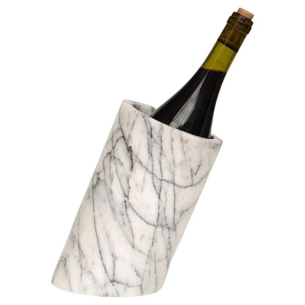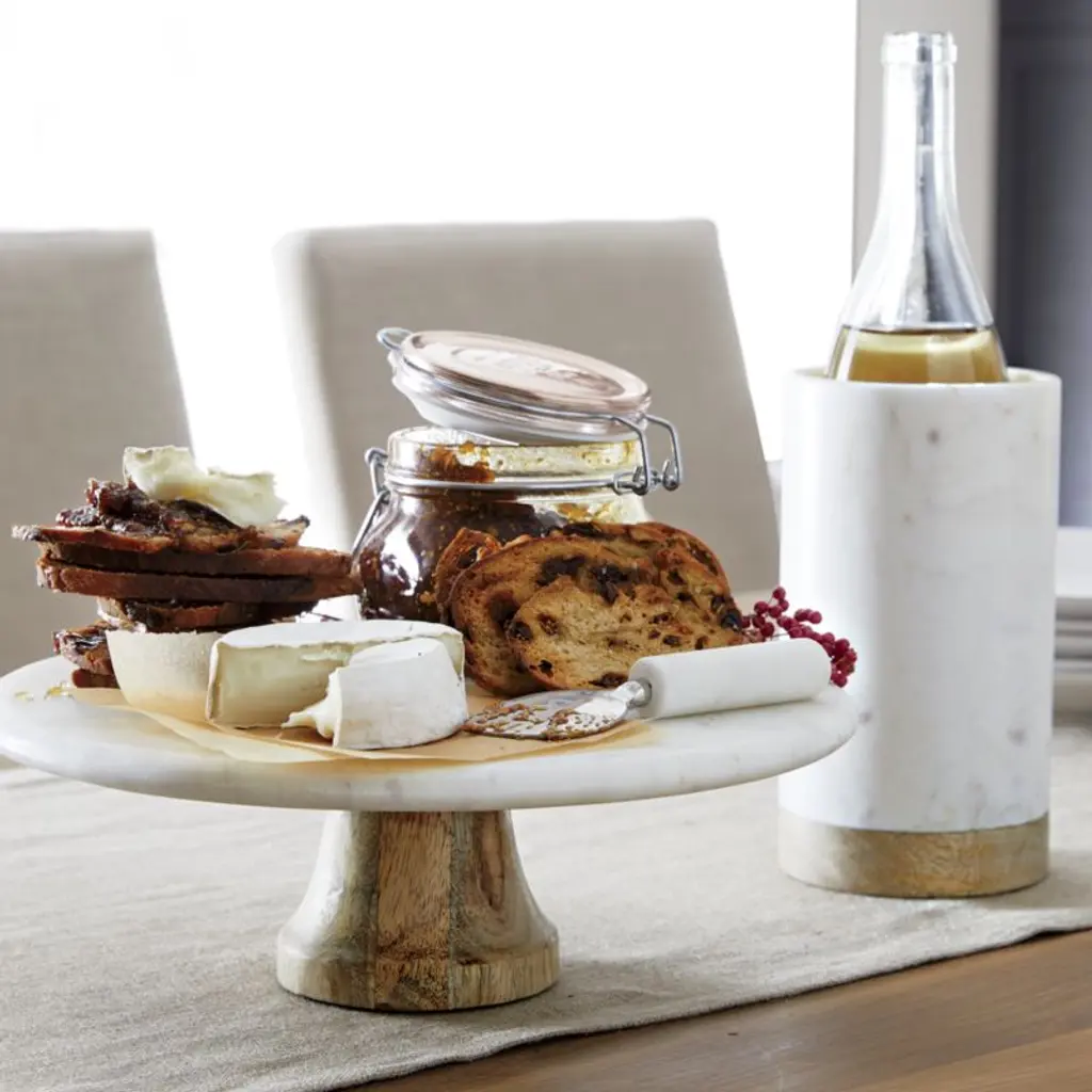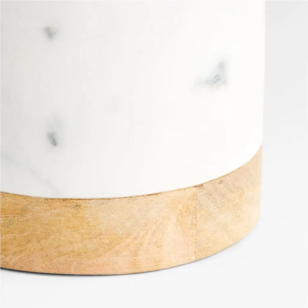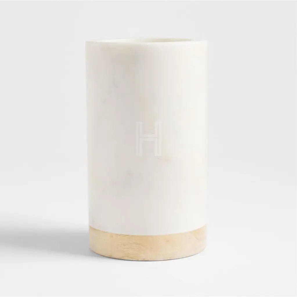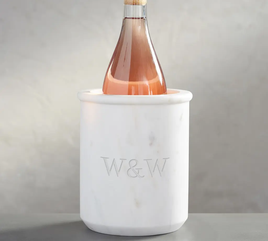 Turned mango wood provides the base for marble, an excellent insulator that will keep white wine or rose cool for hours. The hand-finished white marble with subtle grey veining contrasts beautifully with the warm wood. For a cohesive presentation, pair our exclusive wine cooler with the other serving pieces in our wood and marble entertaining collection. Due to the natural materials and handcrafted construction, each wine cooler will vary slightly.