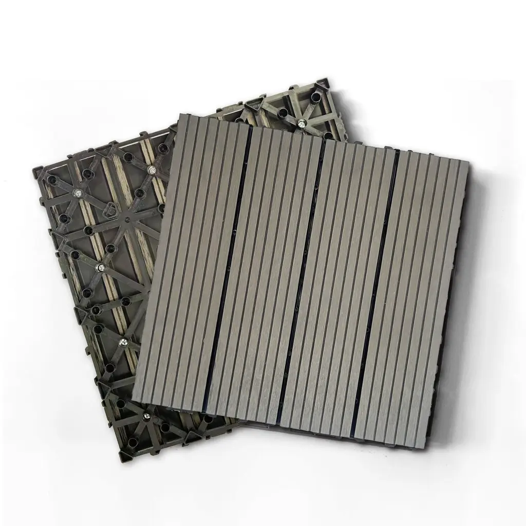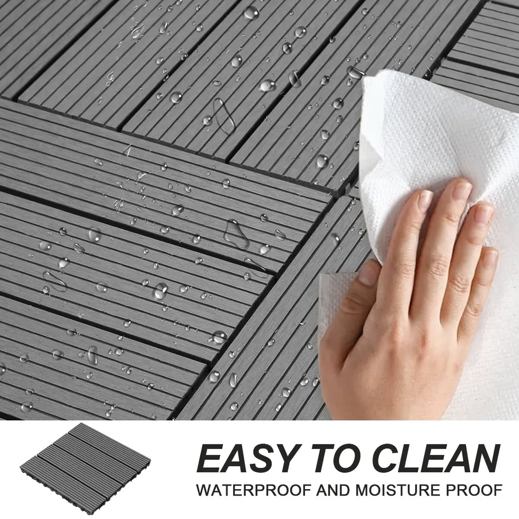 Easy to Install: These deck flooring tiles have an interlocking design base for easy do-it-yourself installation and no tools required for installation.No messy glue, no nails, perfect match and precision spacing between every tile.Unique Design:Our wooden tiles has a simple, beautiful design that can be used indoors and outdoors,4 slats per tile,there is a small gap between each slats for better drainage.Indoor & Outdoor Use: The interlocking deck tiles has PP platform base allows for adequate drainage and moisture, Great for decks, patios, balconies, around pools, saunas, showers, sun rooms, mud rooms, bedrooms, and more.High Quality:Our wood flooring tiles are made of wood-plastic composites. Wood-plastic composite material makes superior water resistance compared to natural wood, resistant to swelling or decay, slip resistant. Super durability and fade resistance.It is eco-friendly product for your home to create a beautiful space both inside and outside.