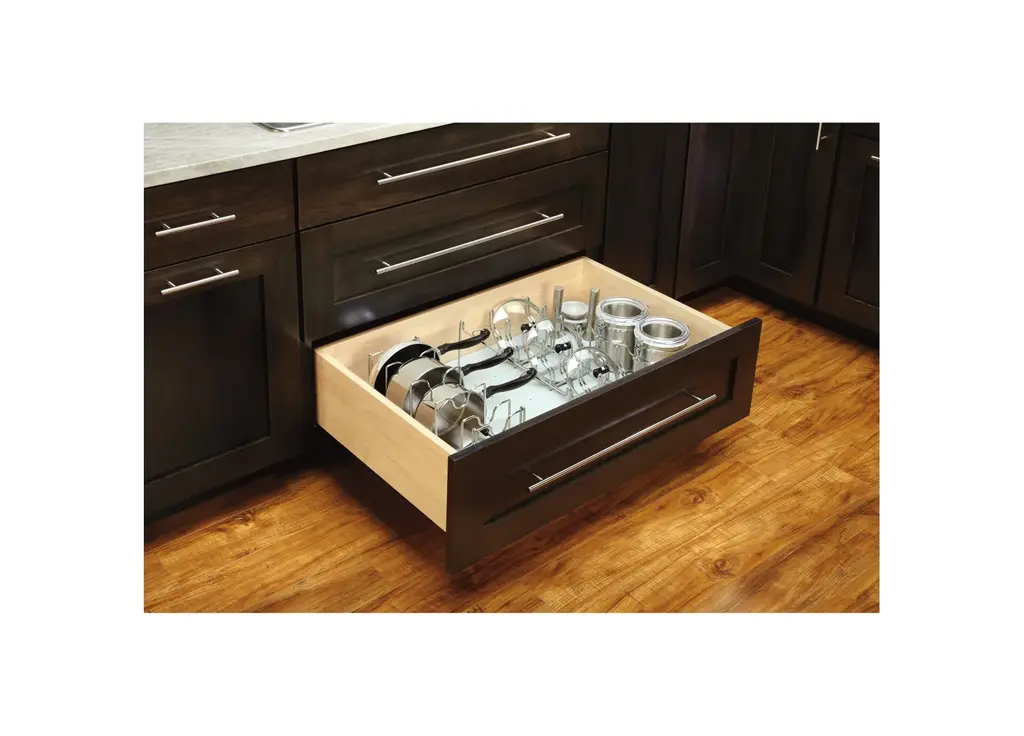 Rev-A-Shelf has made it easy to organize your deep drawers with our wood peg board system. Available in three standard sizes. Each size can be trimmed to fit and with the easy drop-in installation you can take your drawer from drab and messy to chic and orderly within seconds.Included: (1) Vinyl drawer peg board insertPerfect for dishes or other plattersTrim to a custom fit using a table saw for precise cutCoated with a Vinyl top layerDesigned for 30" and 33" drawer cabinetsStainless Steel pegs available (DPS-PEG-4SS, sold separately)Construction: Fully Assembled Maple Wood construction with a clear coat finish for durabilityCan be trimmed to exact size with table saw