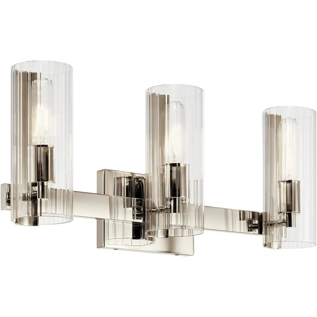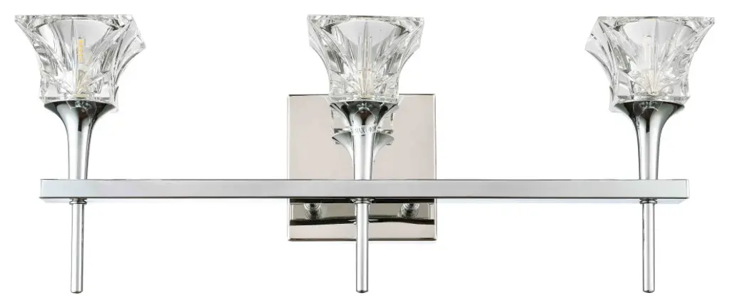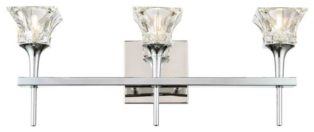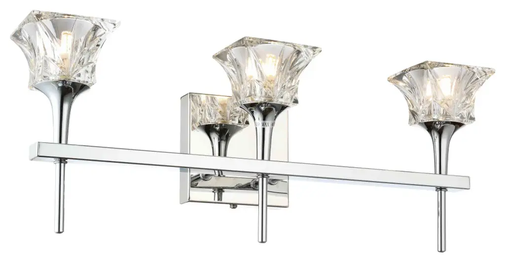 Christina collection features expanding square crystal glass that is on complimentary stem-like hardware to create a pleasant feeling in any room; it consists of fixtures from (min) pendants, chandeliers to vanities. This 3-light bath has chrome finish hardware in the smooth and slim handle for a contemporary design that may bring comfort to the area.Fixture Dimensions 21"W x 7"H x 5.25"EExpanding square crystal glassDamp location installationLight Bulbs IncludedNumber of Bullbs: 3Bulb Type: G9Max Wattage: 40