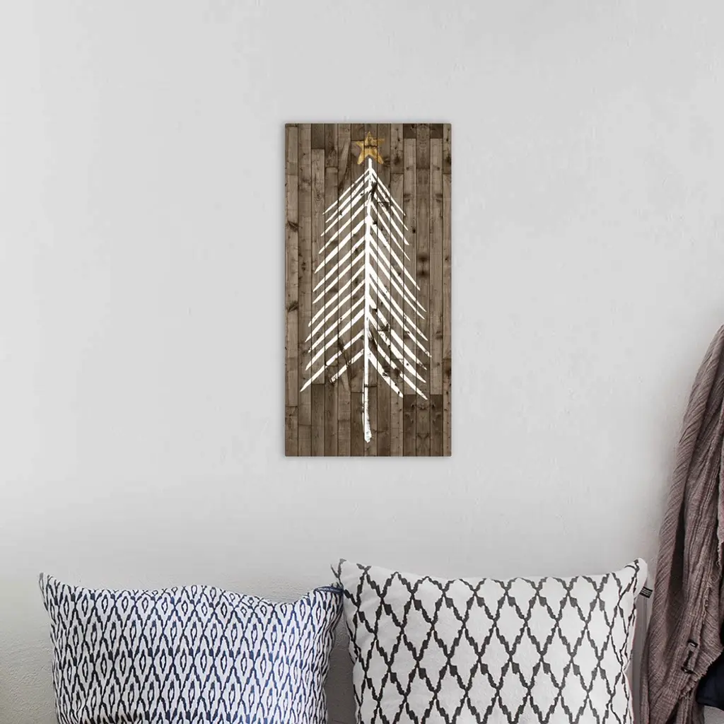 A decorative design of a simple Christmas tree in white with gold accents on a wood backdrop.