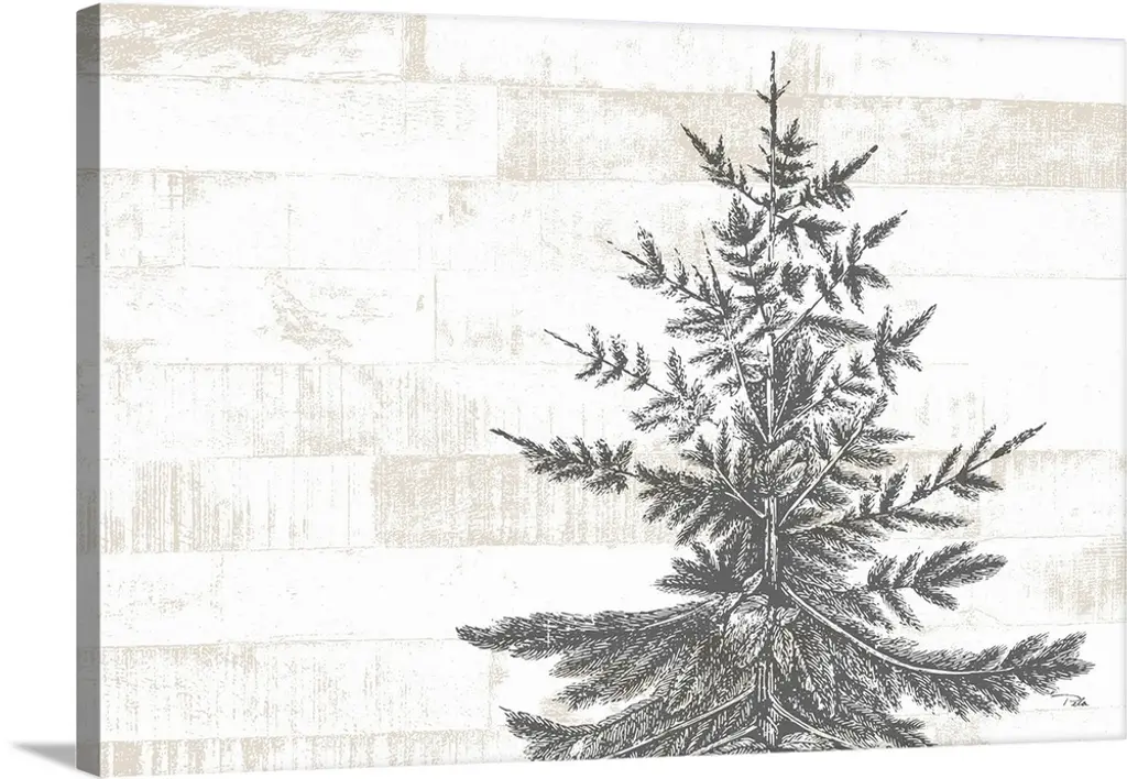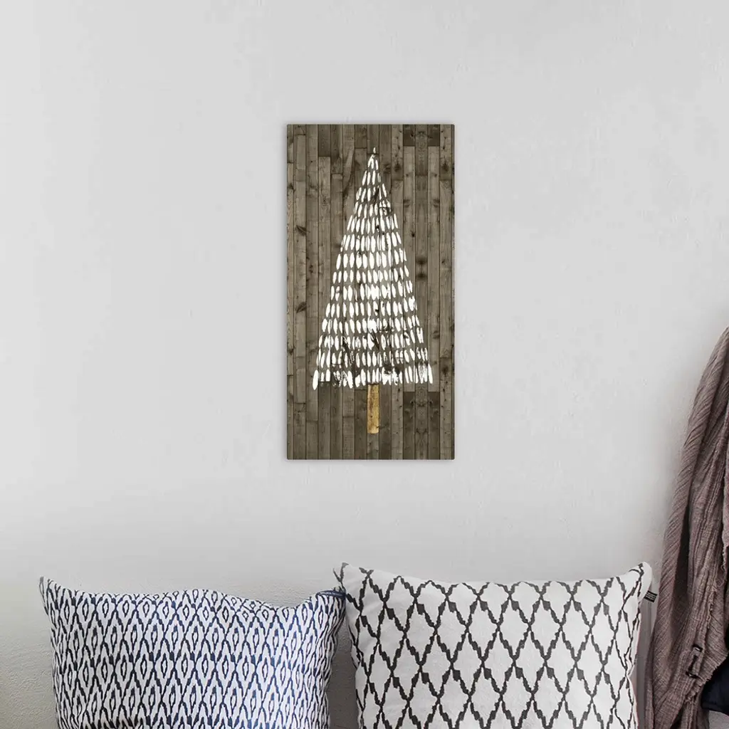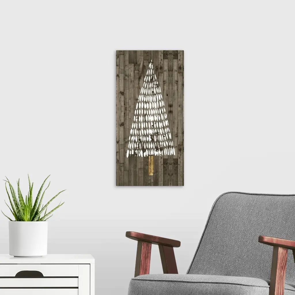 A decorative design of a simple Christmas tree in white with gold accents on a wood backdrop.