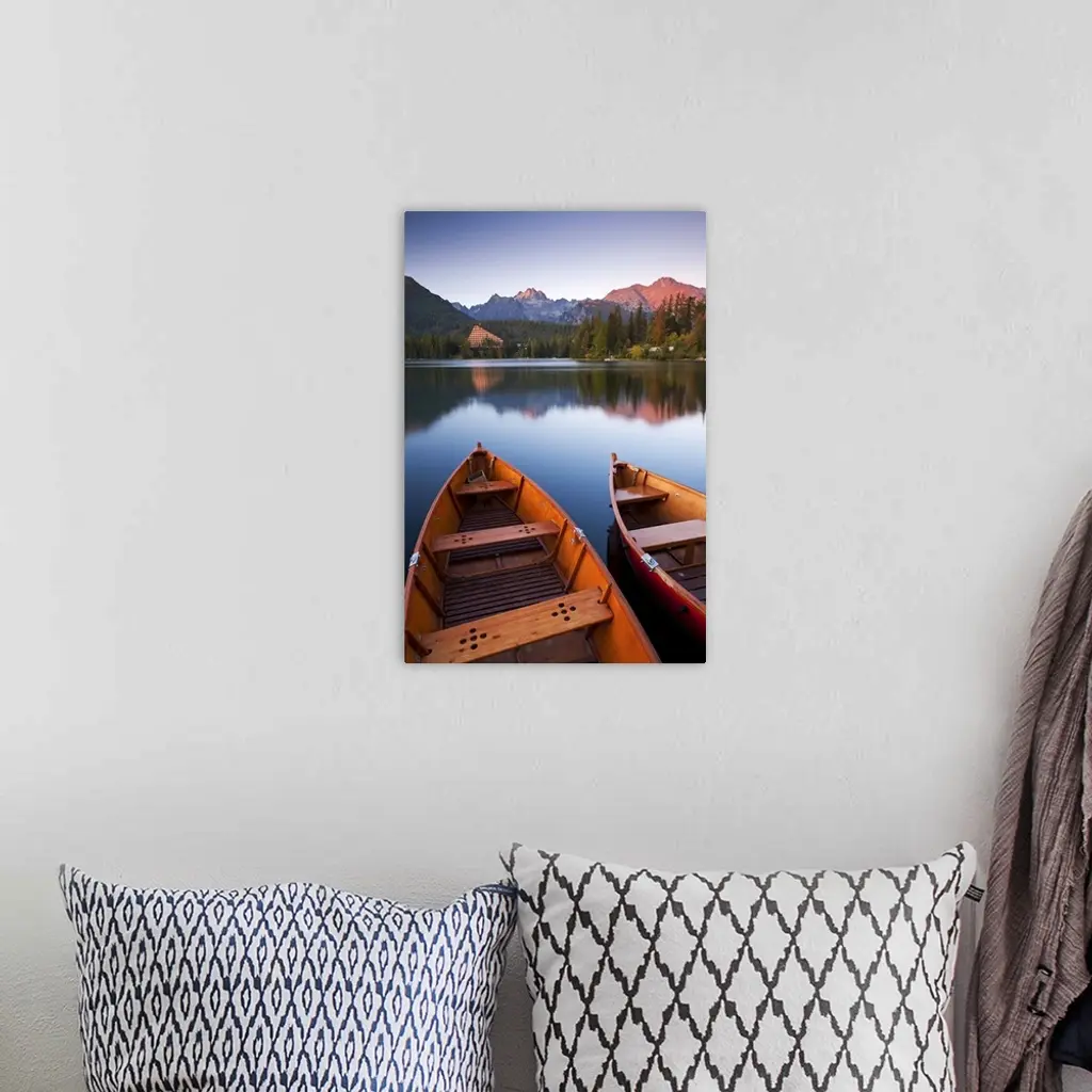 Wooden boats on Strbske Pleso lake in the Tatra Mountains of Slovakia, Europe. Autumn