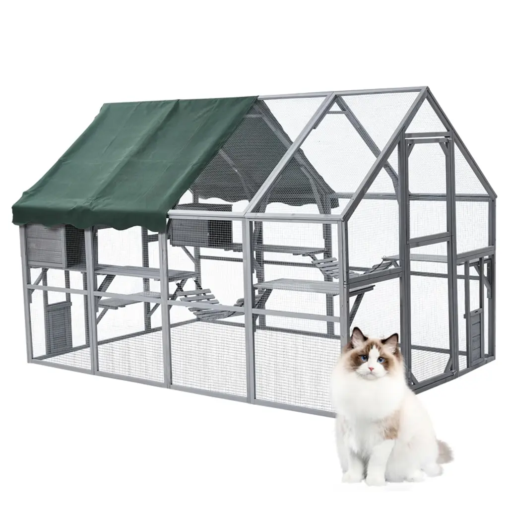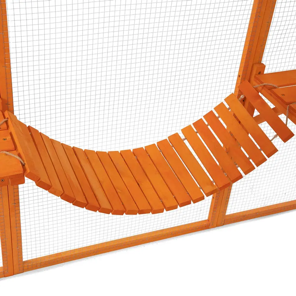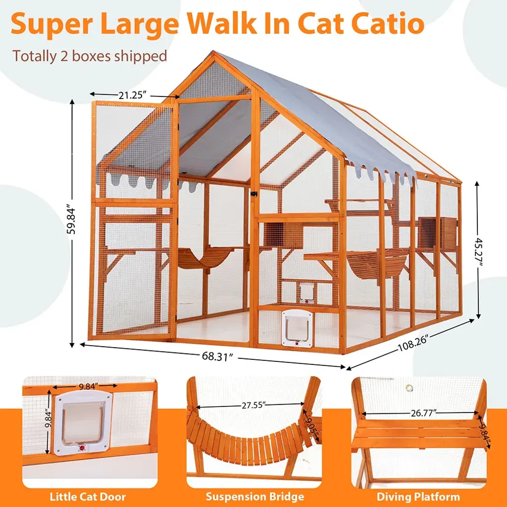 The Wooden Cat Cage is a spacious and comfortable enclosure designed for cats. This cage features a wooden construction, multiple platforms for lounging and playing, and ample space for your feline friend to enjoy the outdoors safely. Features: 【Ample Feline Haven】: This outdoor cat catio is equipped with 7 expansive jumping platforms, 4 sun-soaked boards, 4 robust galvanized meshes, a pair of connecting bridges, and 2 cozy condos, offering your beloved pets a comprehensive space to frolic and extend their limbs. 【Reliable Construction】: Constructed with premium mongolian scots pine, this solid outdoor cat cage is designed to accommodate multiple felines and other diminutive creatures comfortably. 4 substantial galvanized meshes at the top enhance the enclosure's air circulation capabilities. 【Year-Round Shelter】: Shielded by 4 sunshine boards, this cat house ensures that your furry companions enjoy a cool retreat on bright days, aiding in maintaining their health and reducing the risk of dehydration. The waterproof design guarantees a dry sanctuary for furry babies. 【Convenient Pet Engagement】: With an expansive front door, this cat patio facilitates effortless entry and exit, fostering greater interaction with your pets. The cat flap located in the bottom provides your cats with a smooth transition between the interior and exterior environments. 【Multi-Scene Application】: Following the step-by-step user manual, you can install the kitty window kennel in your backyard, patio, garden and more. Your furry babies can enjoy their own little world in this spacious cat cage. Specifications: Color: Grey/Orange Material: Mongolian Scots Pine + Wire Mesh + Sunshine Board Overall Dimensions: 108.48"L x 70.87"W x 74.02"H Front Door Dimensions: 59.85"L x 21.26"H Kitten Door Dimensions: 9.84"L x 9.84"H Cat Jumping Platform Dimensions: 26.77"L x 9.84"W Bridge Dimensions: 27.56"L x 9.06"W Cat Condo Dimensions: 9.84"L x 10.24"W x 15.35"H Net Weight: 94.58 lbs Package includes: 1 x Cat Playpen 1 x Instruction Manual