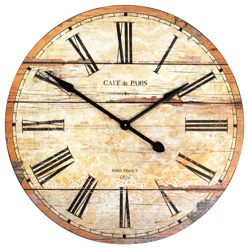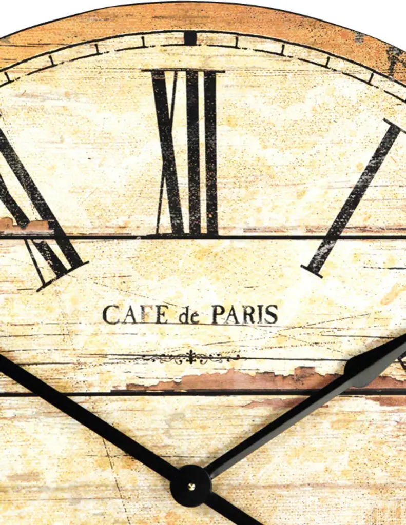 Create a chic, vintage feel in your home with the help of the Wooden Clock. Made from compressed wood with a distressed white finish, this open-faced clock has black Roman numerals, classic black hands, and small "Cafe de Paris" French print. Requires one AA battery, battery not included.