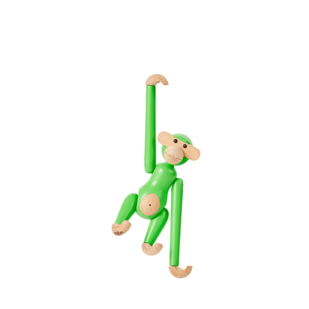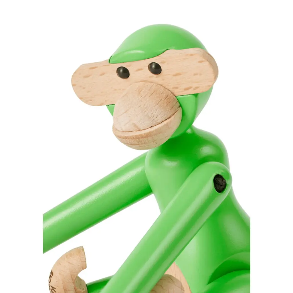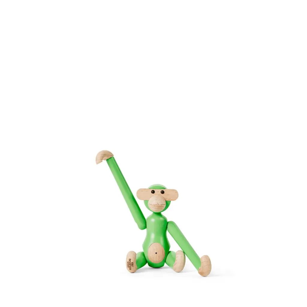 The Wooden Monkey, designed by Kay Bojesen, is a beloved classic of Scandinavian design. This mini-sized monkey is made of beech, colored with lovely light green and measures 3.74 in (9,5 cm) in height. Please note that the head of the mini monkey, the smallest member of Bojesen's monkey family, is not movable. Bojesen's monkey with its mischievous look and light-colored belly has transformed kids’ rooms into jungles and sparked dreams of far-away places since 1951. It has a permanent role on Danish television as the mascot of wildlife programs and as a prize in quiz shows. Every monkey consists of 31 wooden parts and is crafted by hand. Due to slight variations in shade and wood grain, the monkeys have a unique and charming personality.