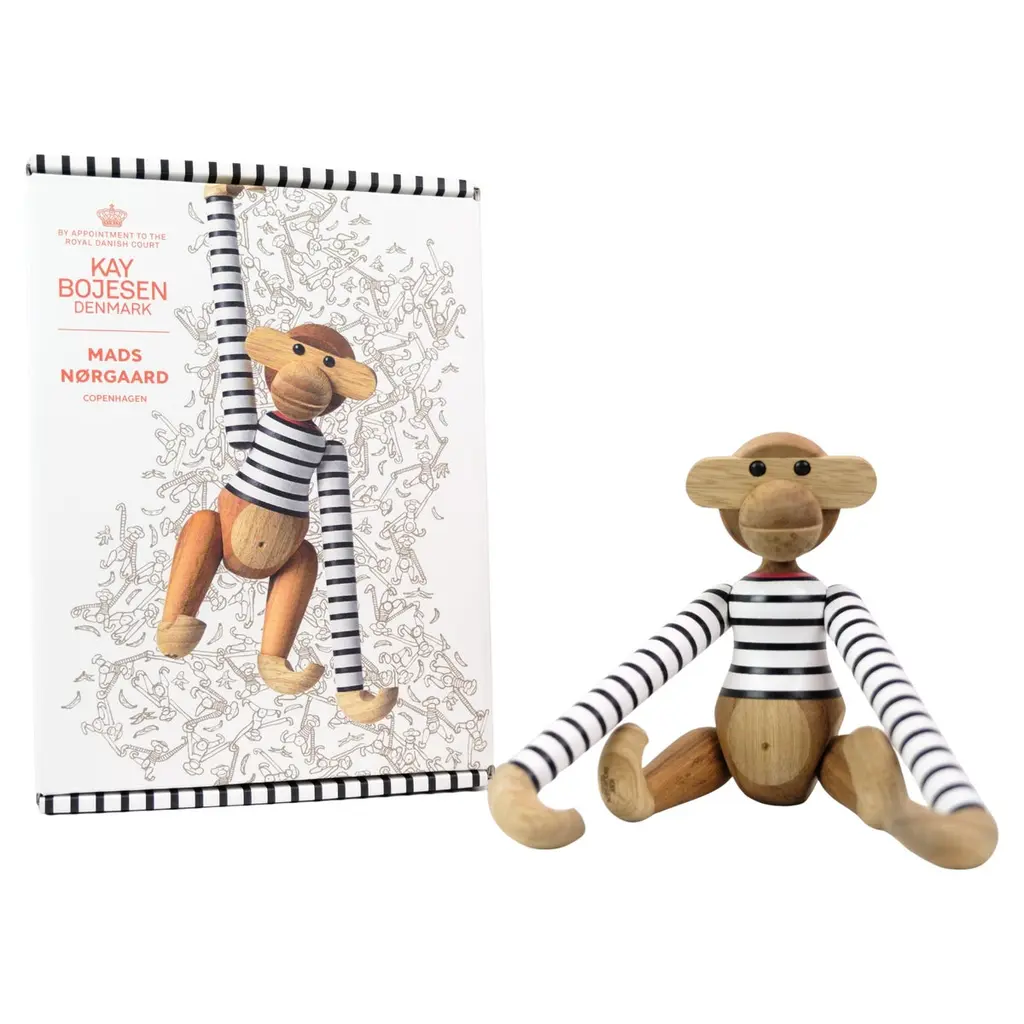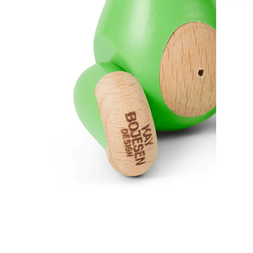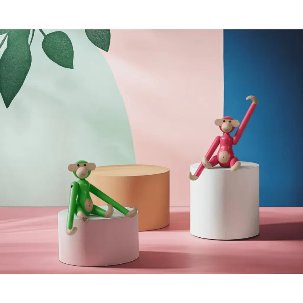 The Wooden Monkey, designed by Kay Bojesen, is a beloved classic of Scandinavian design. This mini-sized monkey is made of beech, colored with lovely light green and measures 3.74 in (9,5 cm) in height. Please note that the head of the mini monkey, the smallest member of Bojesen's monkey family, is not movable. Bojesen's monkey with its mischievous look and light-colored belly has transformed kids’ rooms into jungles and sparked dreams of far-away places since 1951. It has a permanent role on Danish television as the mascot of wildlife programs and as a prize in quiz shows. Every monkey consists of 31 wooden parts and is crafted by hand. Due to slight variations in shade and wood grain, the monkeys have a unique and charming personality.