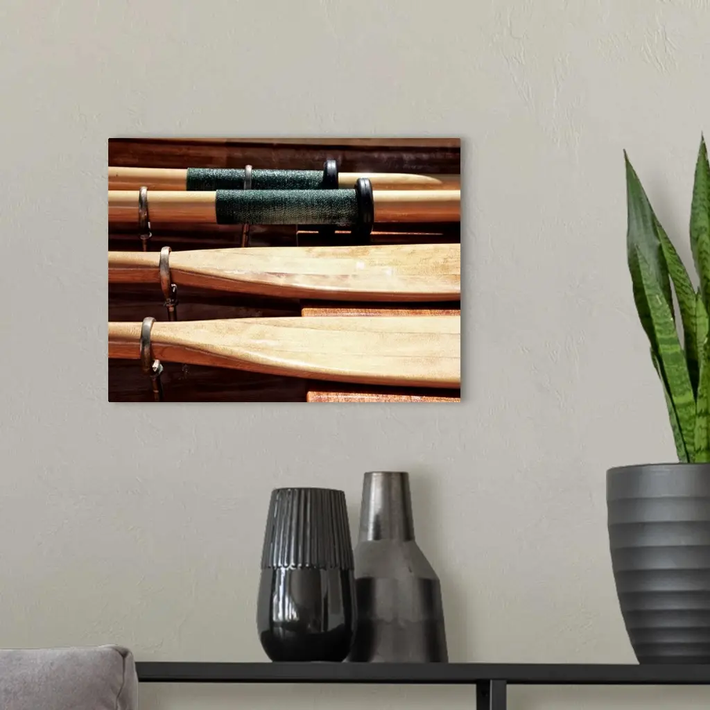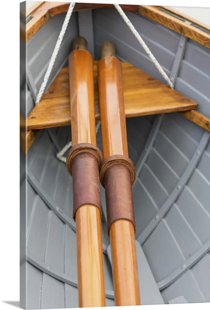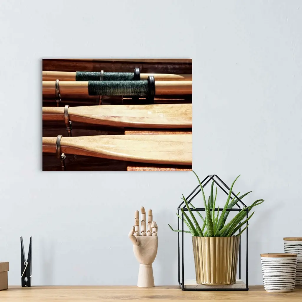 Close-up photograph of wooden oars laid out on a boat.