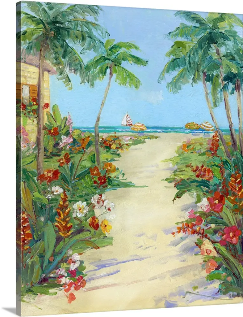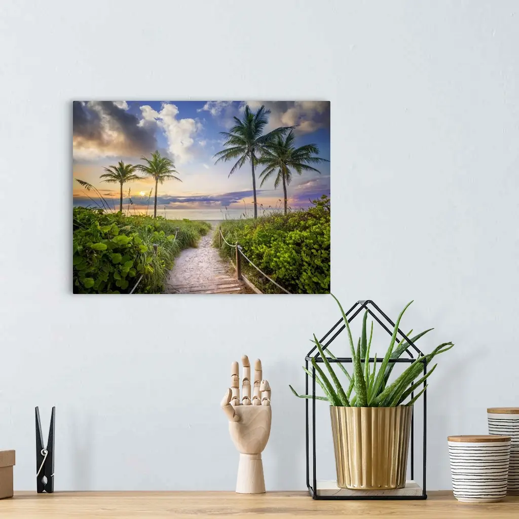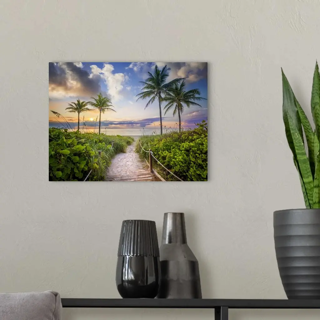 Wooden Path To The Beach Surrounded By Tropical Palm Trees, Miami Beach, Florida