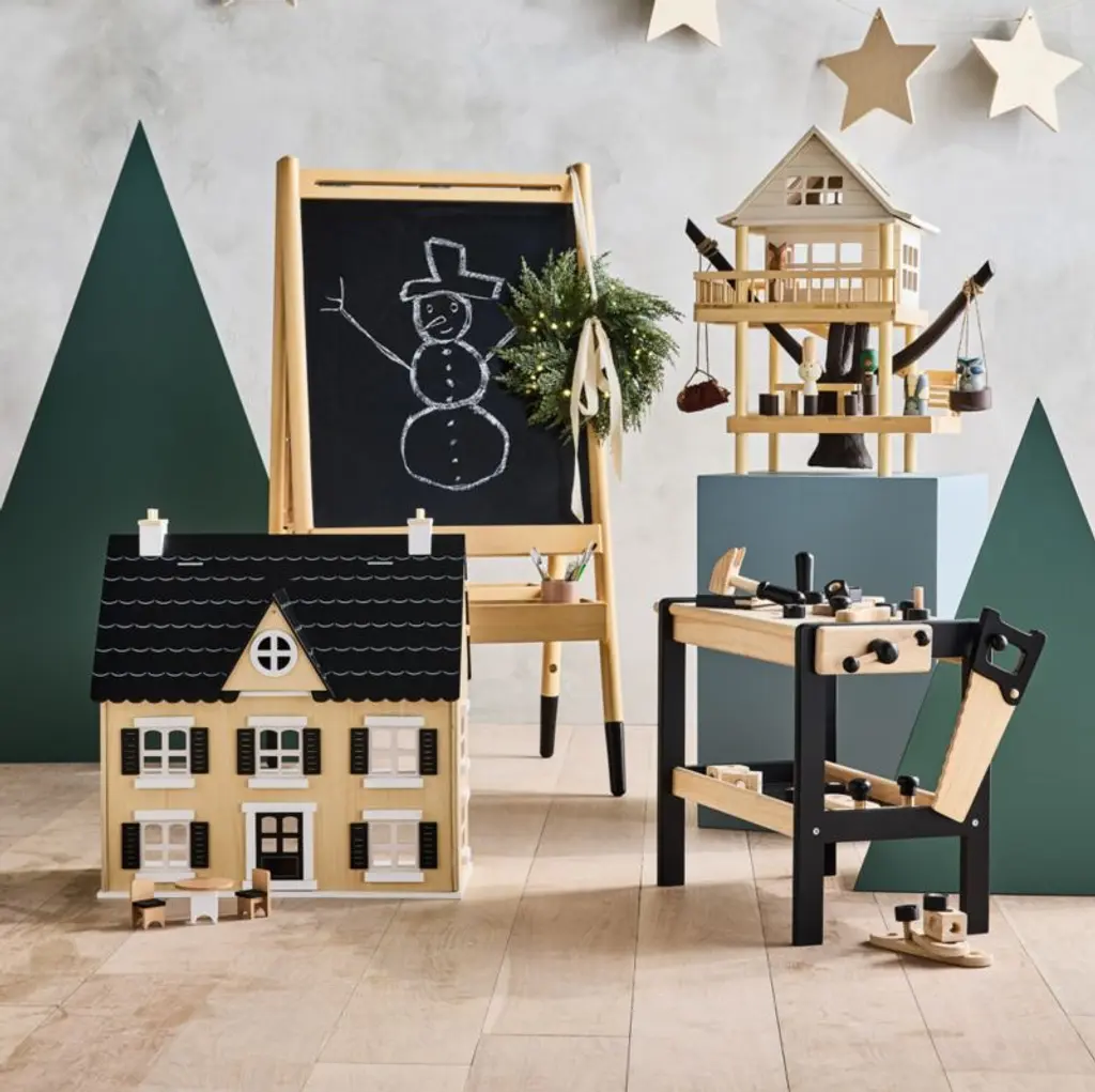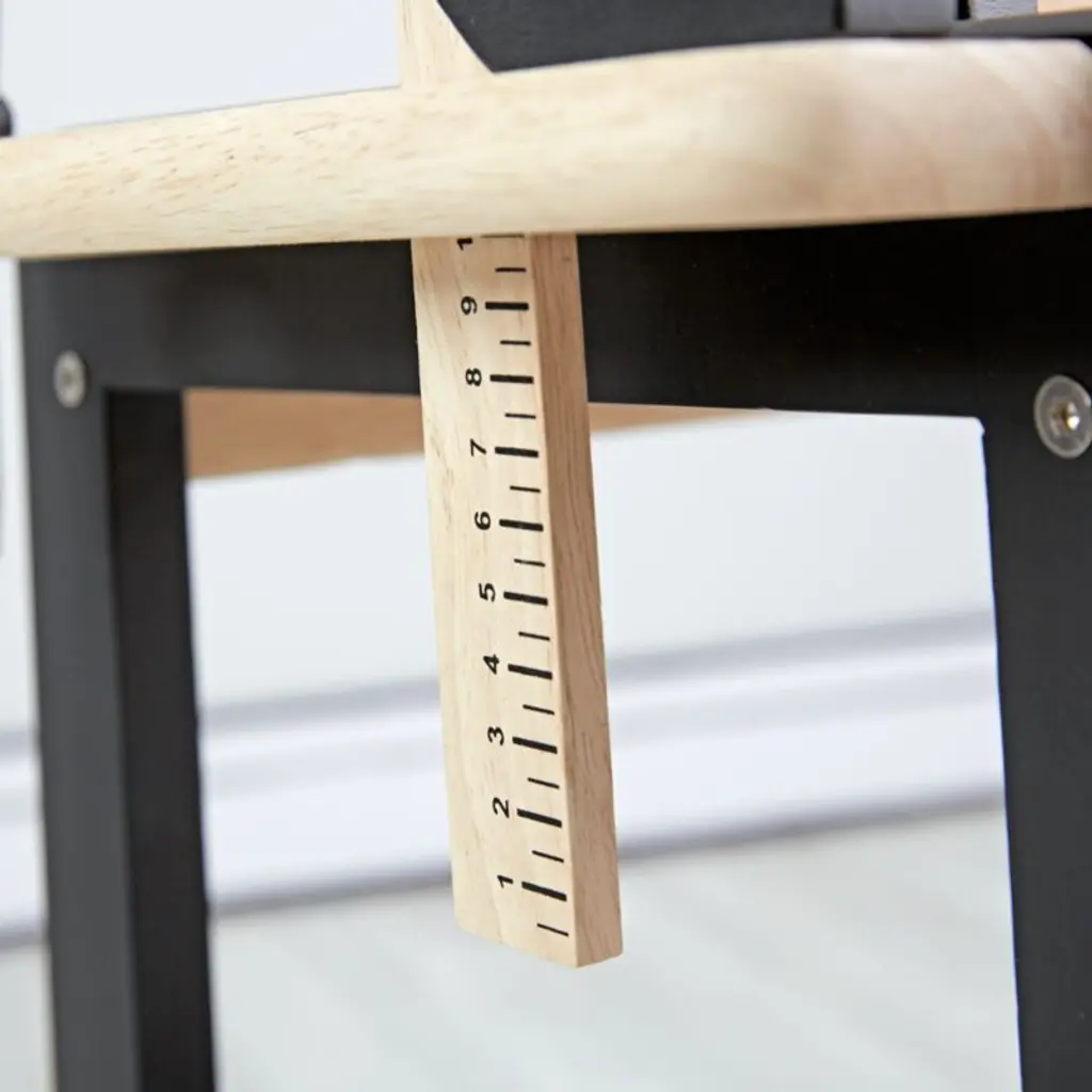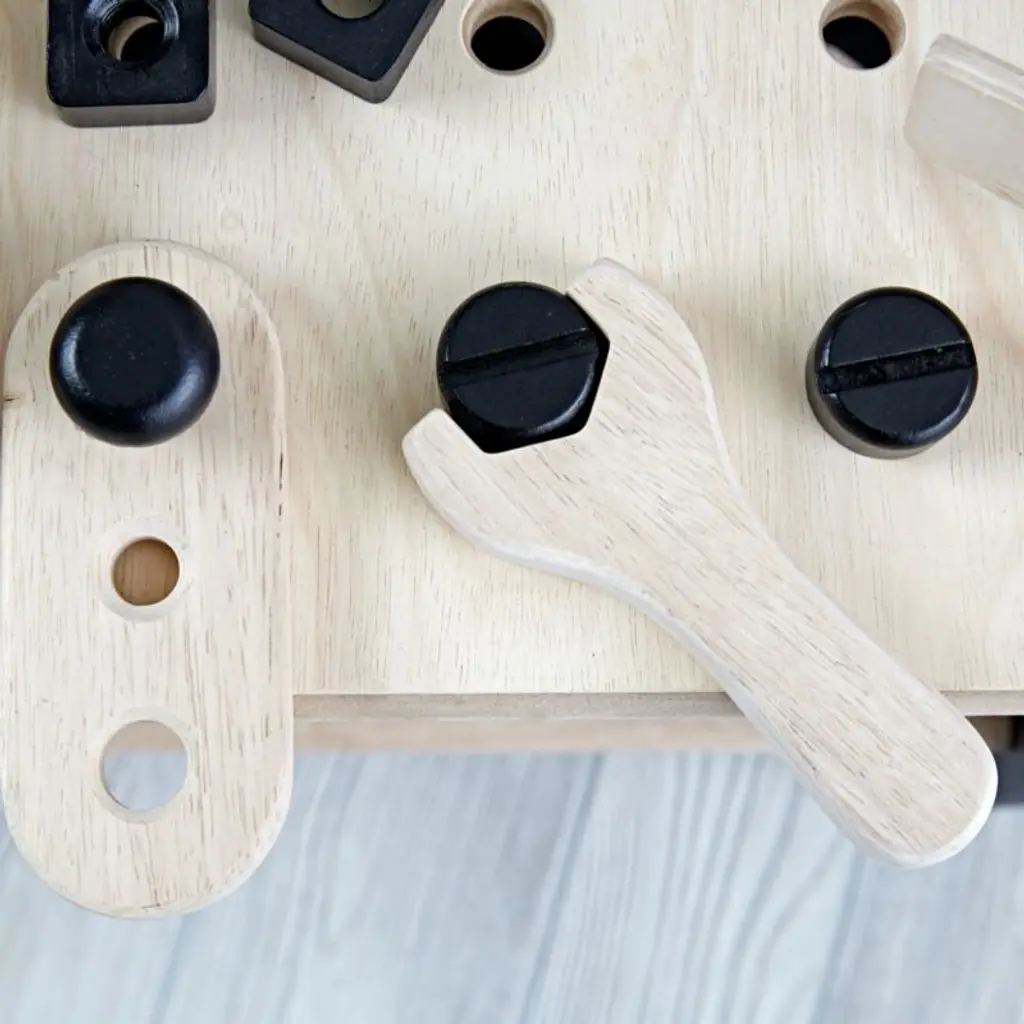 Kids can take care of their pretend DIY projects with some help from our toy wooden workbench and tool set. It's stocked with a wooden play hammer, saw, wrench, screwdriver and ruler. Plus, there are hardware pieces and blocks that can be interlocked to make custom creations. The kids toy workbench also has a bottom shelf and side storage to hold everything, plus a top surface with holes for the bolts. Perfect for little builders ages three and up, it's an imaginary play essential for all those pretend home improvement tasks.
