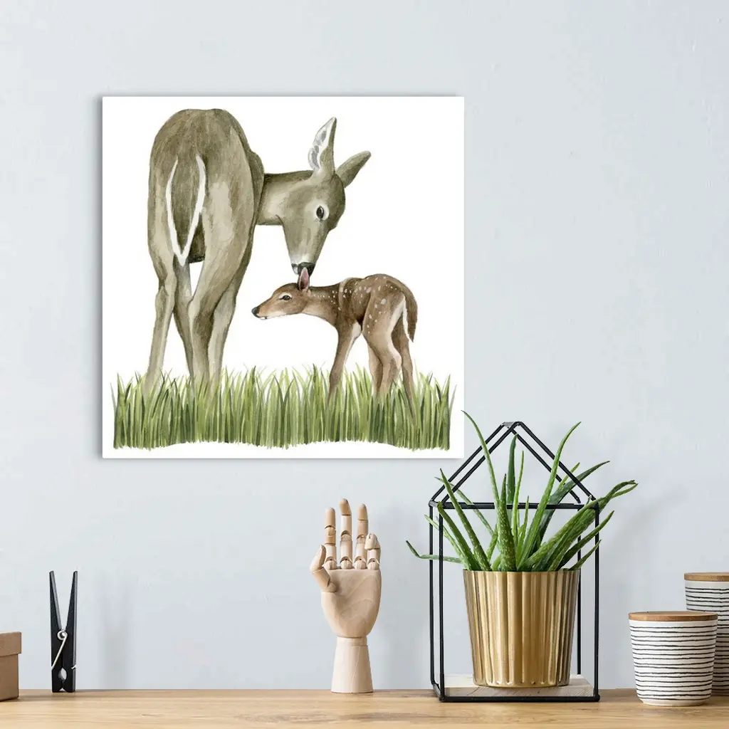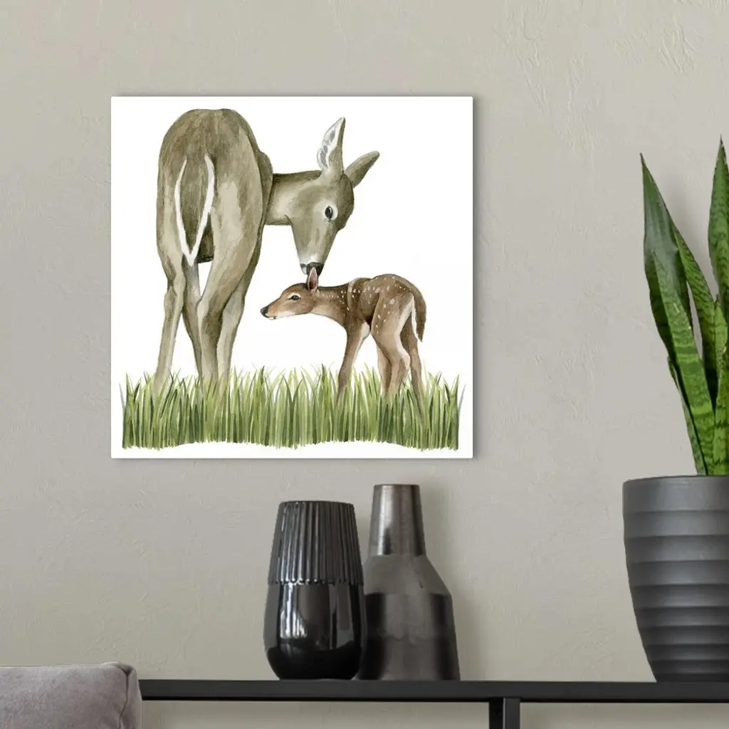 Watercolor portrait of a deer and its fawn on a grassy landscape.