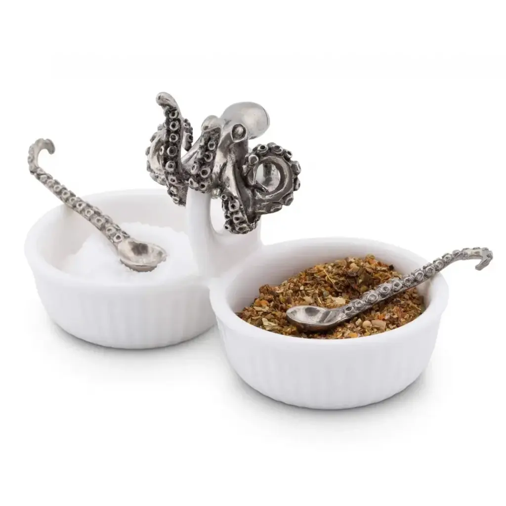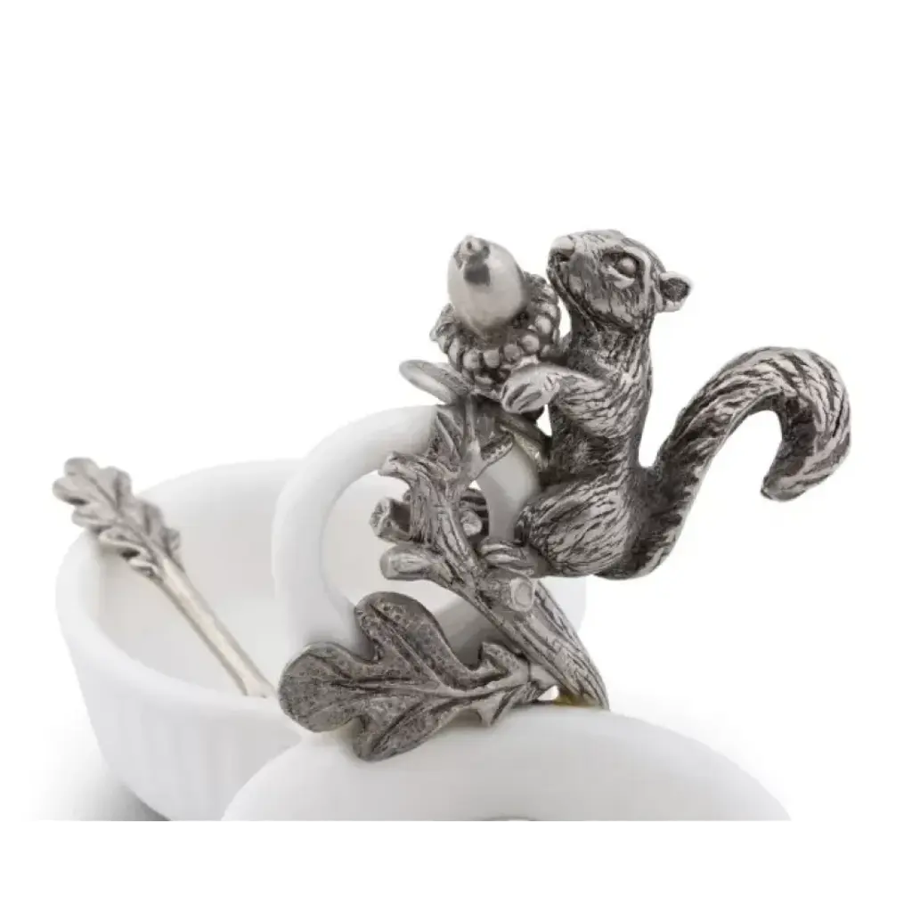 Perched on a pewter twiglet dividing Vagabond House’s Squirrel Double Salt Cellar, Stanley, the company signature squirrel is offering up a tiny acorn to go along with your chosen spices. Crafted in fine stoneware, the white divided cellar holds salt or spices of your choice. Vagabond House's trademark artistic attention to detail in pewter is on full display, note the tiny oak leaf handles of the 2 pewter salt spoons. Vagabond House’s Woodland Creatures Collection brings happy home. Spunky squirrels, playful bears and curious raccoons are among the whimsical pewter forest dwellers frolicking on natural log, acacia wood, fine stoneware and glass creations designed to bring smiles to your table and home. Each side will hold a generous Tablespoon of your favorite spice Vagabond House is a family-owned American company specializing in fine pewter tableware, servingware and giftware. Largely inspired by nature, their exclusive products are designed to be unique, functional heirlooms for those who seek to express tradition and style in both family and formal entertaining.
