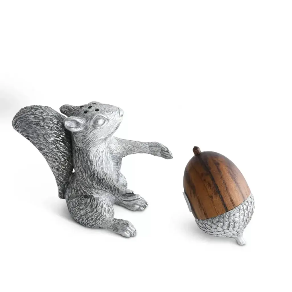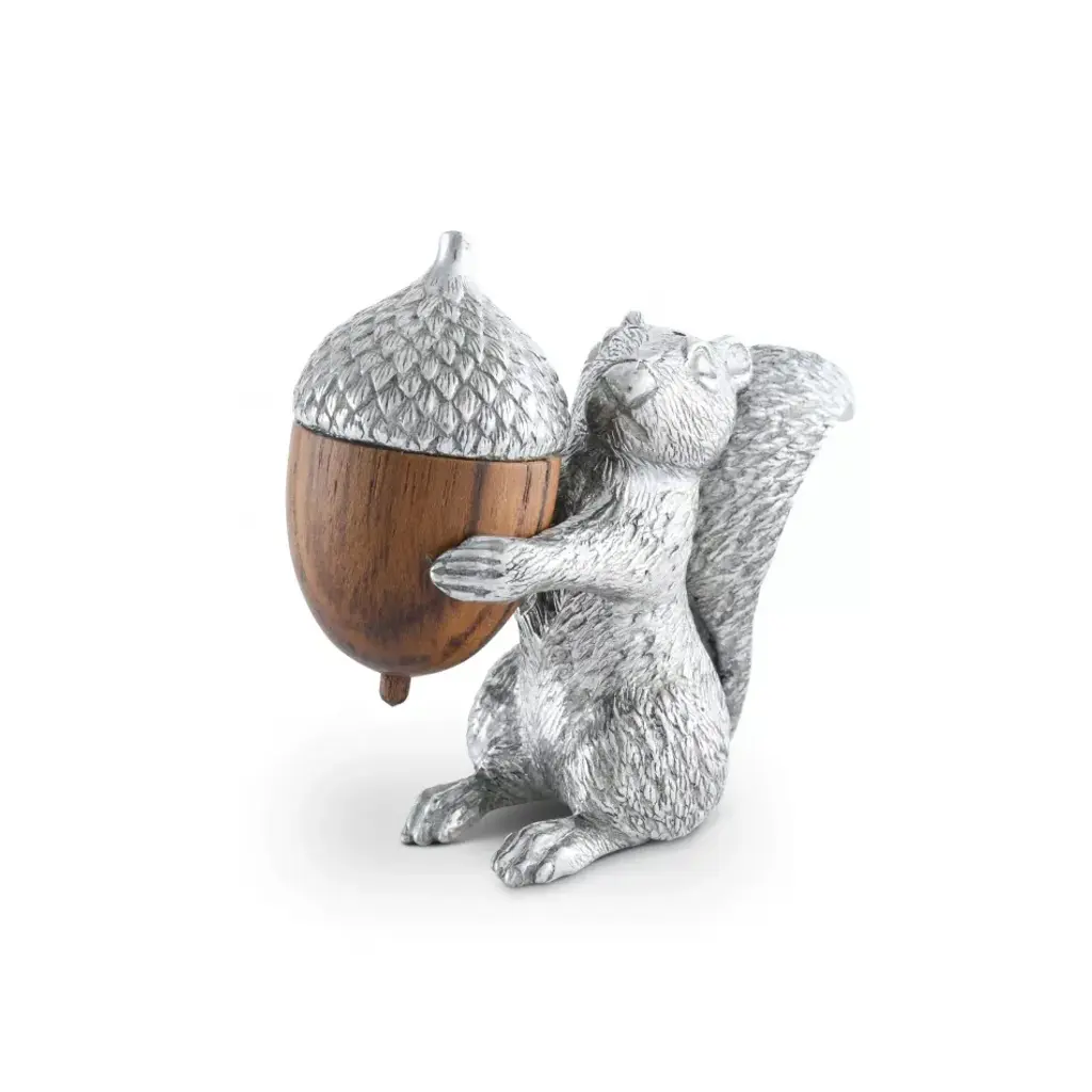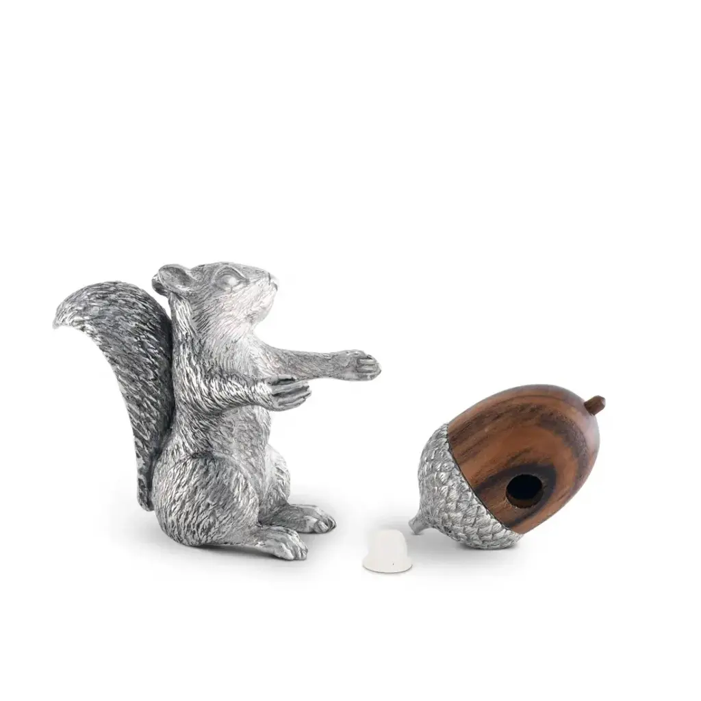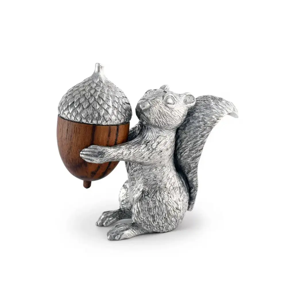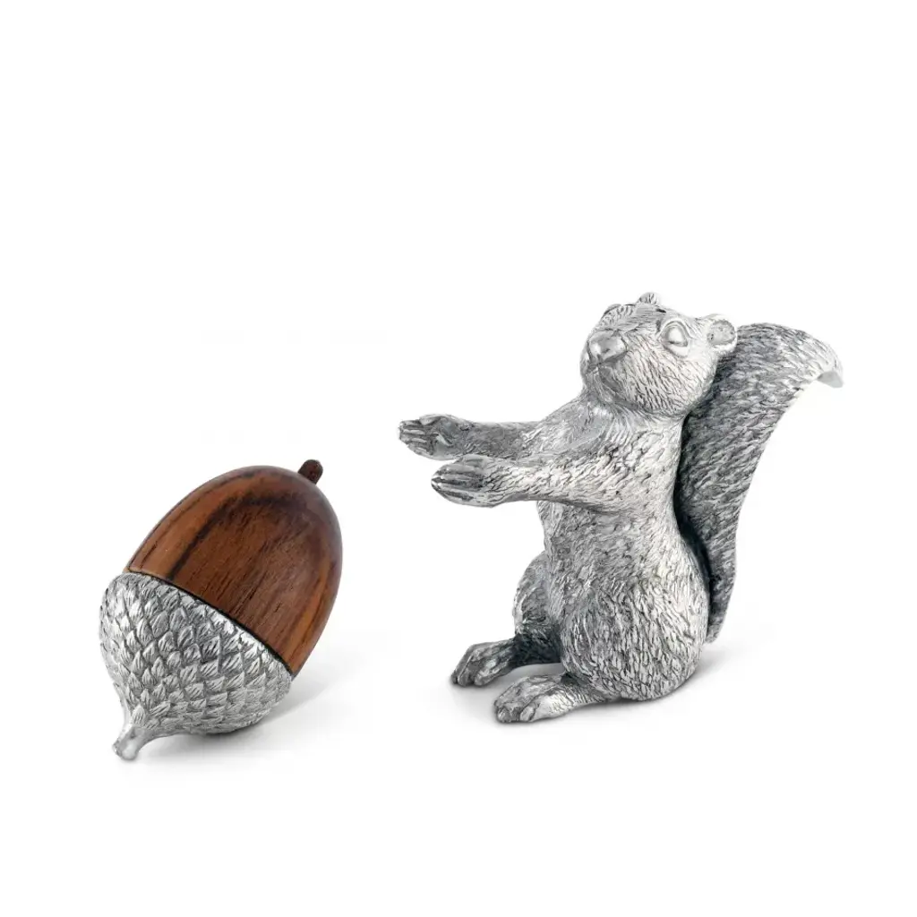 Ready to help delight your guests, Vagabond House's Squirrel with Wood Acorn Salt and Pepper Set features one of Vagabond House's trademark squirrels offering a wooden acorn with a pewter cap to add spice and style to your table. The saucy squirrel with his beloved acorn is nicknamed Sparky because of his tendency to spark up conversation amongst the family and friends at your table. He is one of our darling family of squirrels that liven up Vagabond House products. Vagabond House is a family-owned American company specializing in fine pewter tableware, servingware and giftware. Largely inspired by nature, their exclusive products are designed to be unique, functional heirlooms for those who seek to express tradition and style in both family and formal entertaining.