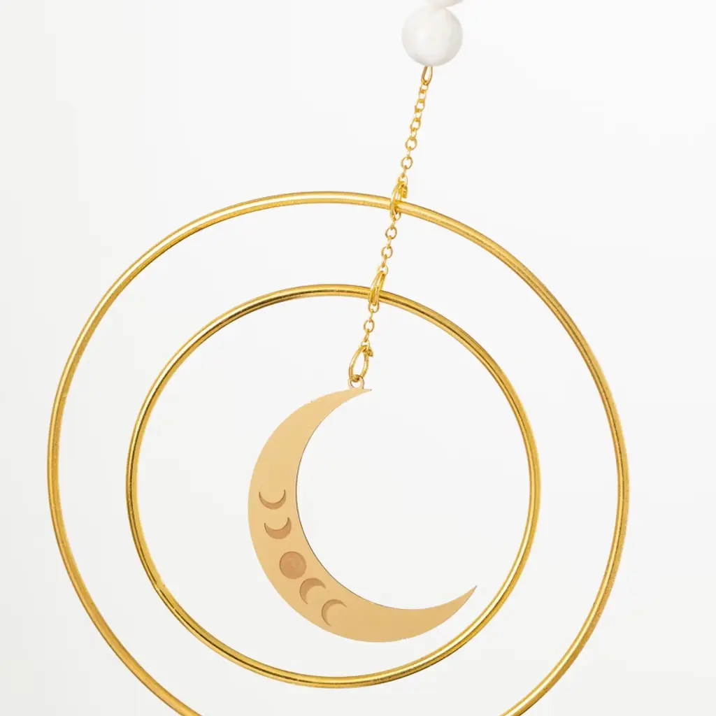 Bring the tranquil beauty of the night sky into your home with this elegant crescent moon suncatcher. A sleek crescent moon symbol sits gracefully within concentric gold-tone rings, offering a minimalist and celestial-inspired design. Below, a faceted crystal prism catches sunlight, creating vibrant rainbows that fill your space with warmth and light. The suncatcher is adorned with three soft white stone beads along a delicate gold chain, evoking purity, serenity, and a connection to the cosmos. Perfect for windows, meditation spaces, or as a thoughtful gift, this suncatcher adds a touch of celestial magic to any setting.