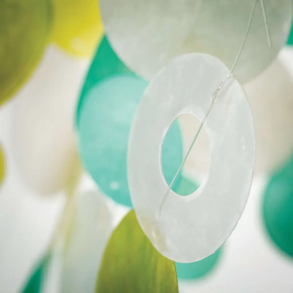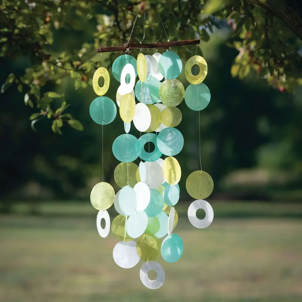 A cascading chime in a pleasing color reminiscent of a gift of nature. Our handcrafted capiz windchimes are made by Balinese artisans. Hand strung and hand dyed these chimes are made of natural renewable materials. When touched by the wind your chime will produce a delicate tinkling musical sound.