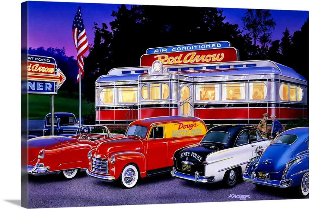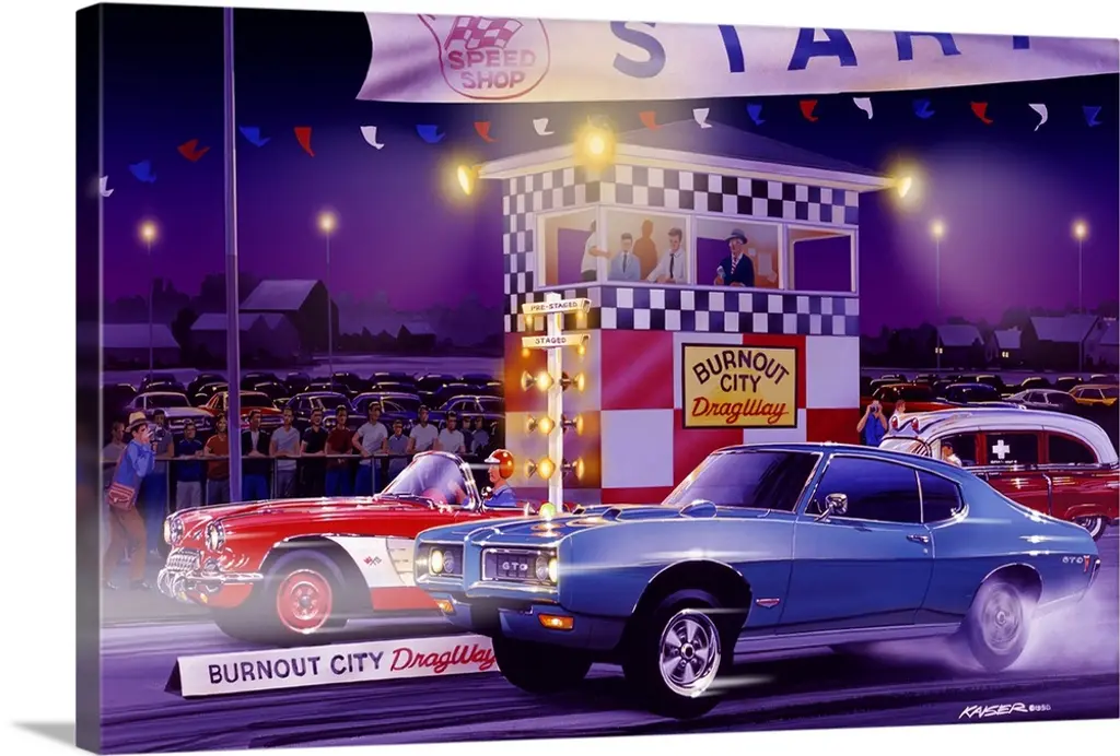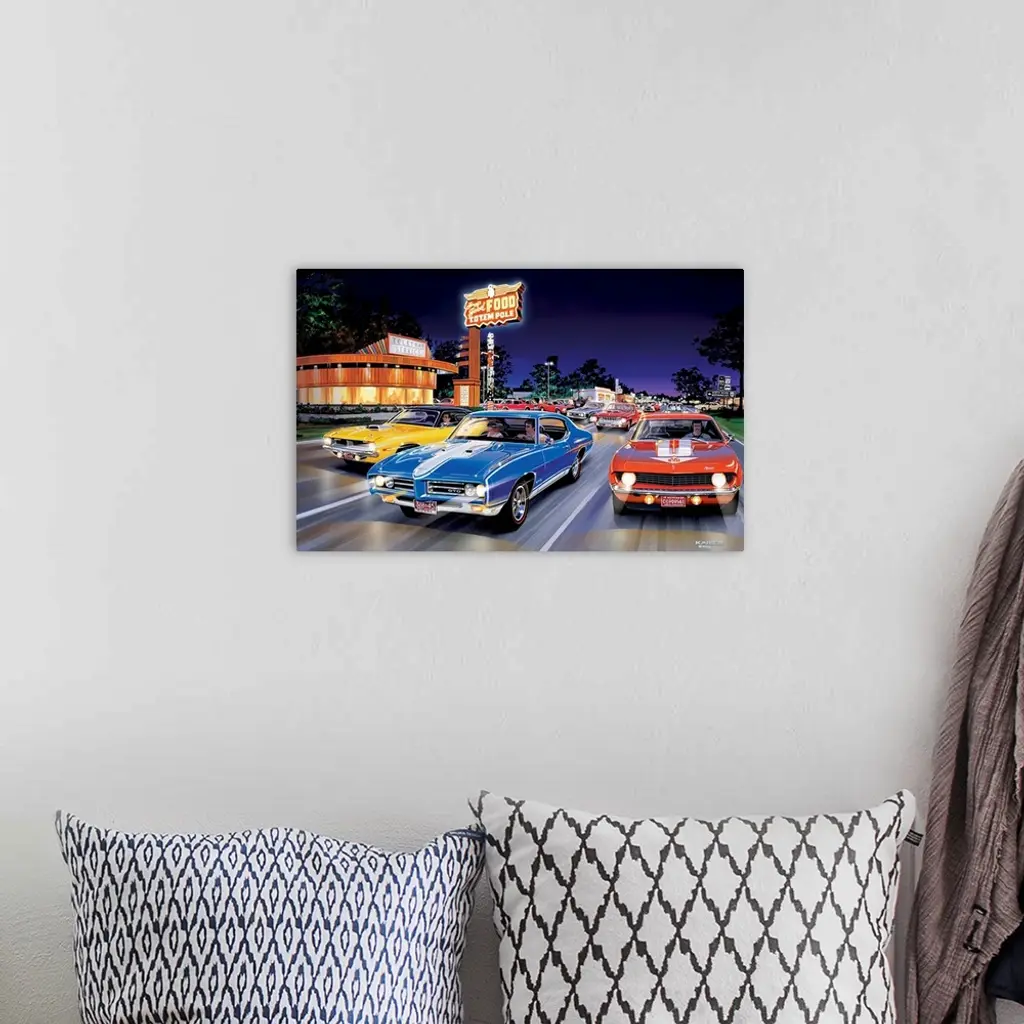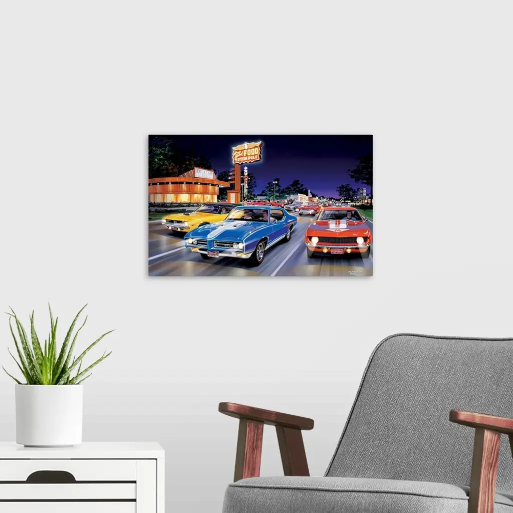 A highway in Detroit, Michigan well know for cruising and street racing in the 60s-70s is filled with classic muscle cars including a Pontiac GTO. Famous for many fast food drive-ins where races were organized.