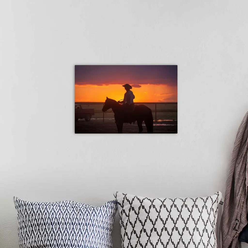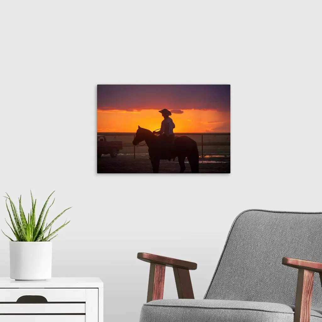 Silhouette photograph of a cowboy on horseback with a beautiful purple and orange sunset in the background.