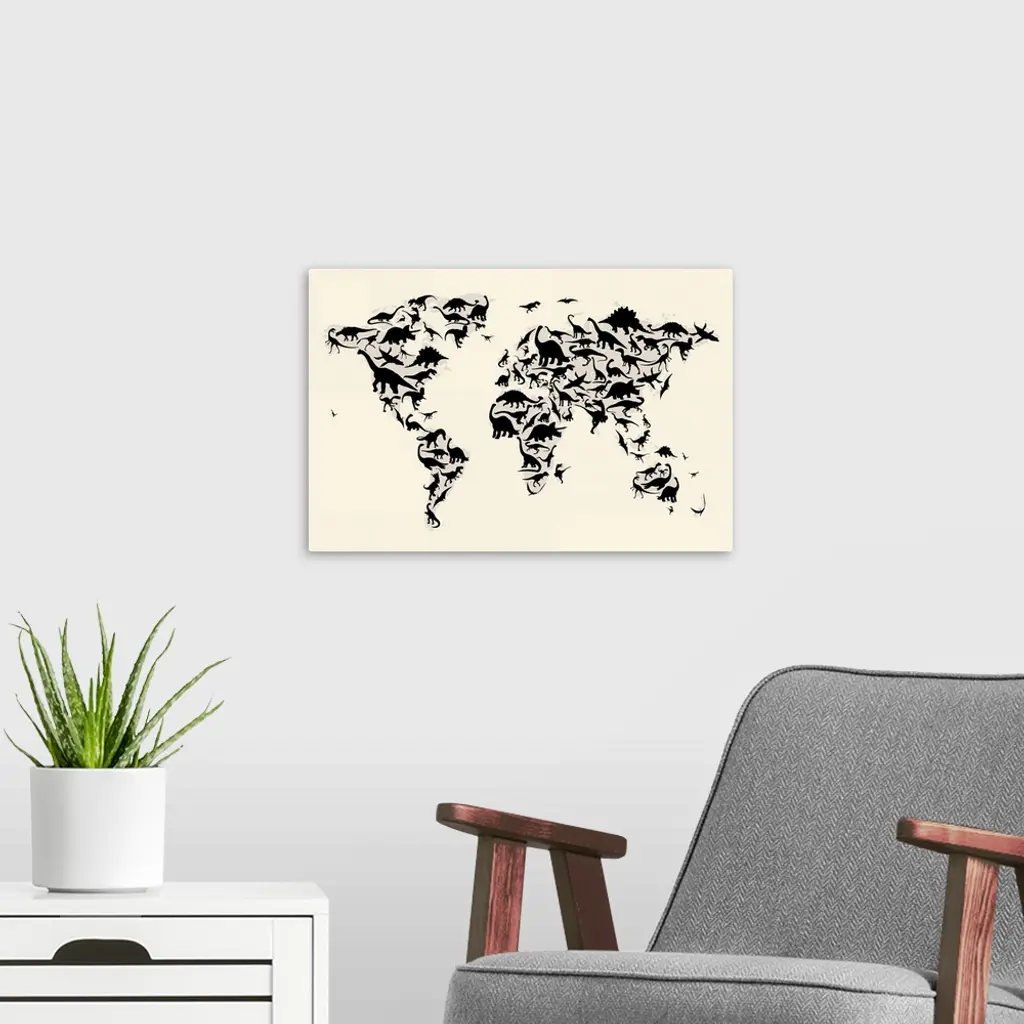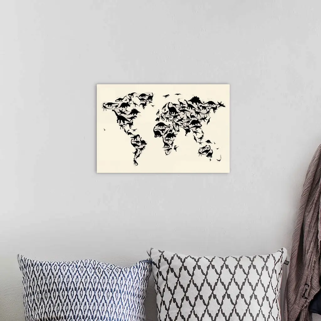 Large, landscape wall hanging of the world map made up of the silhouettes of various dinosaurs, on a solid, light background.