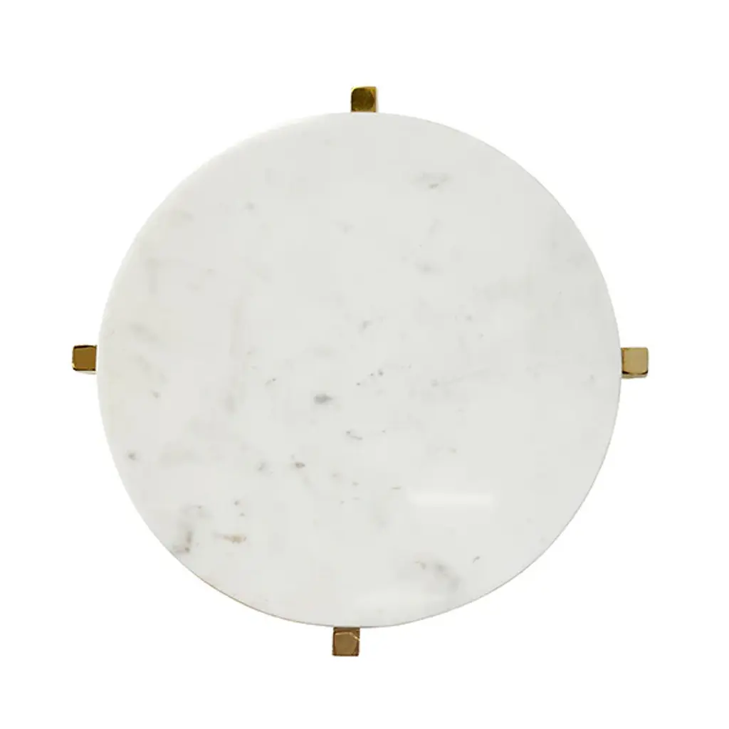 The Worlds Away Winslet drinks table features an elongated, sculptural brass brass with a round white marble top.