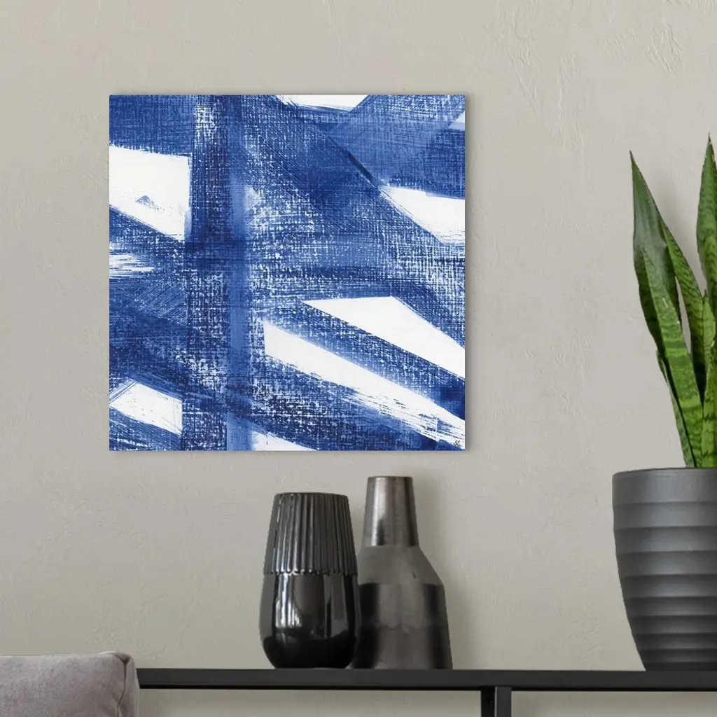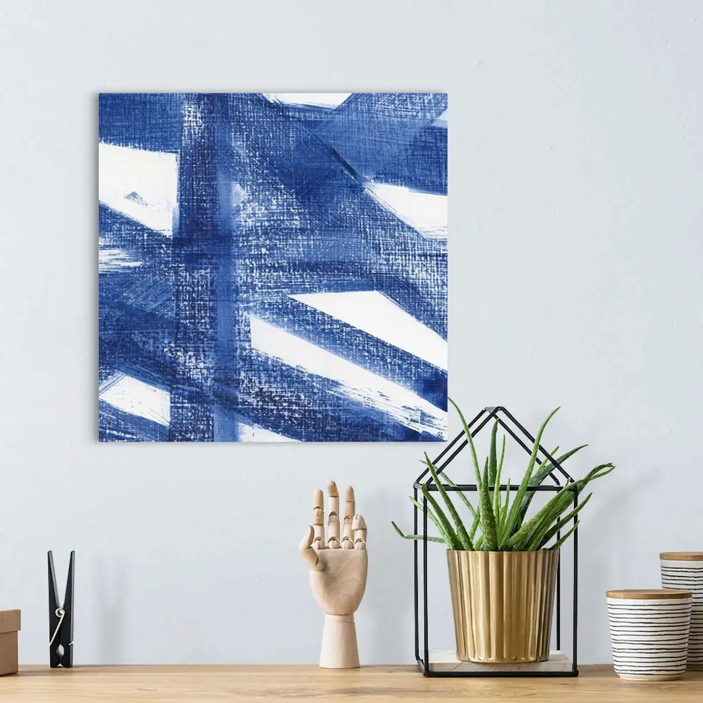 Large blue brushstrokes sweeping in all directions on a crosshatched white background.