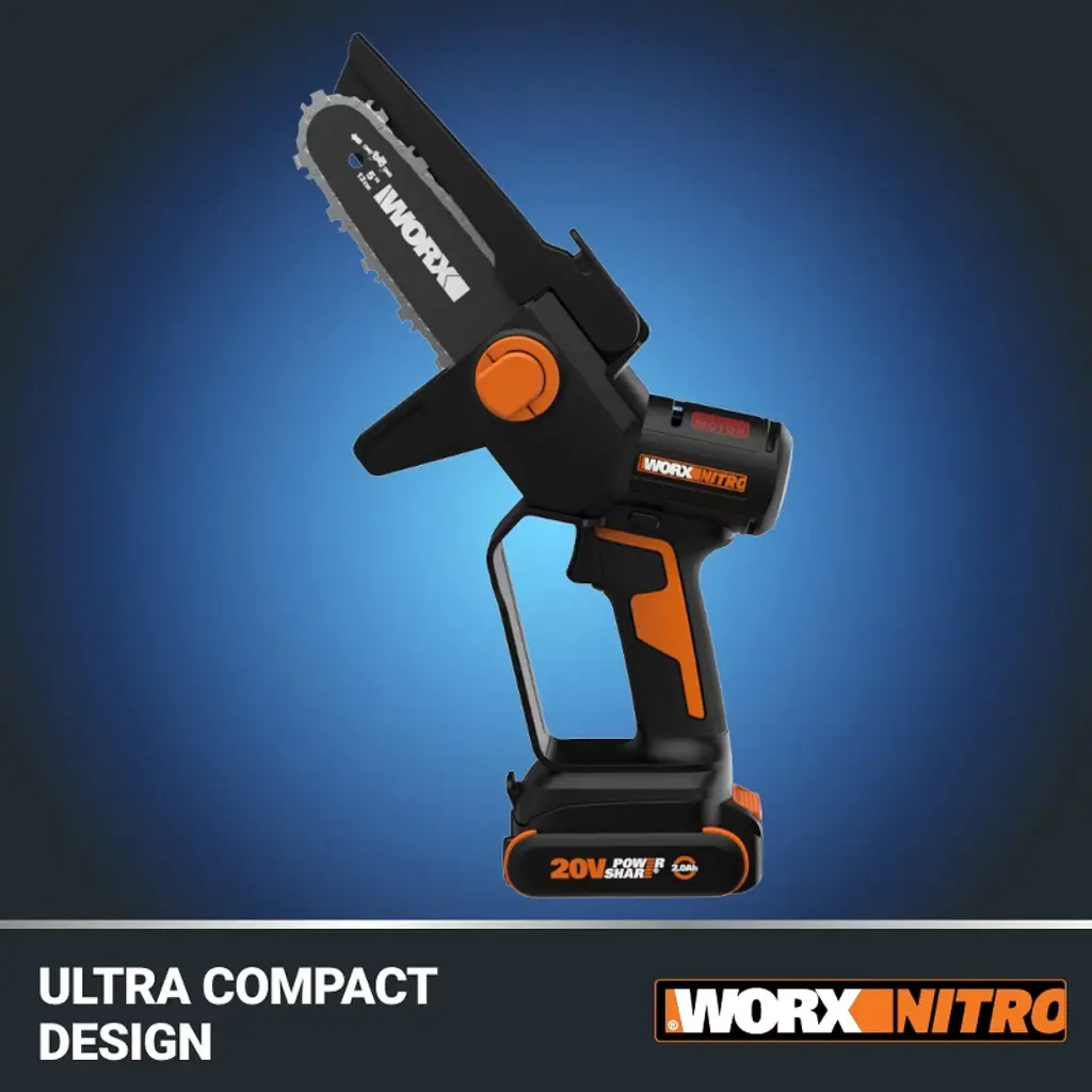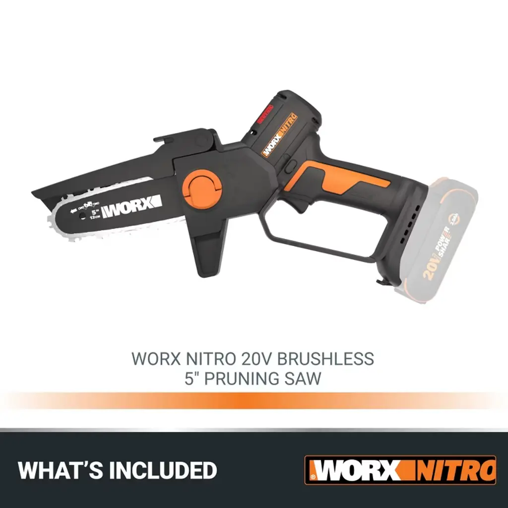High-powered, pro-grade cutting is never a chore with the Worx Nitro 20V Brushless 5” Cordless Pruning Saw. Refined with an ultra-compact design and lightweight body profile, this pruning saw is easy and comfortable to maneuver—even during extended use or when working in tight spaces. The battery-powered cordless capability offers an extended run time that allows for truly on-the-go cutting. Rely on this impressive mobility to cut firewood at campsites, clear branches on hunting trails, trim trees on large properties, and much more. The 5” bar length is ideal for a variety of cutting tasks—including pruning, trimming, delimbing, and bucking. The high-efficiency brushless motor heightens the saw’s performance by providing 50% longer run time, 25% more power, a 10X longer life than standard brushed motors. For added convenience, the pruning saw features automatic chain-tensioning for quick and secure chain adjustments. In addition, onboard chain lubrication sustains cutting efficiency without hassle, as well as extends bar and chain life. Safety is prioritized with the retractable bar and chain guard, which retracts automatically when cutting from above. The guard can also be retracted manual when you need to undercut. Whatever the task, rely on the guarded handle design to maximize control while increasing safety and security.