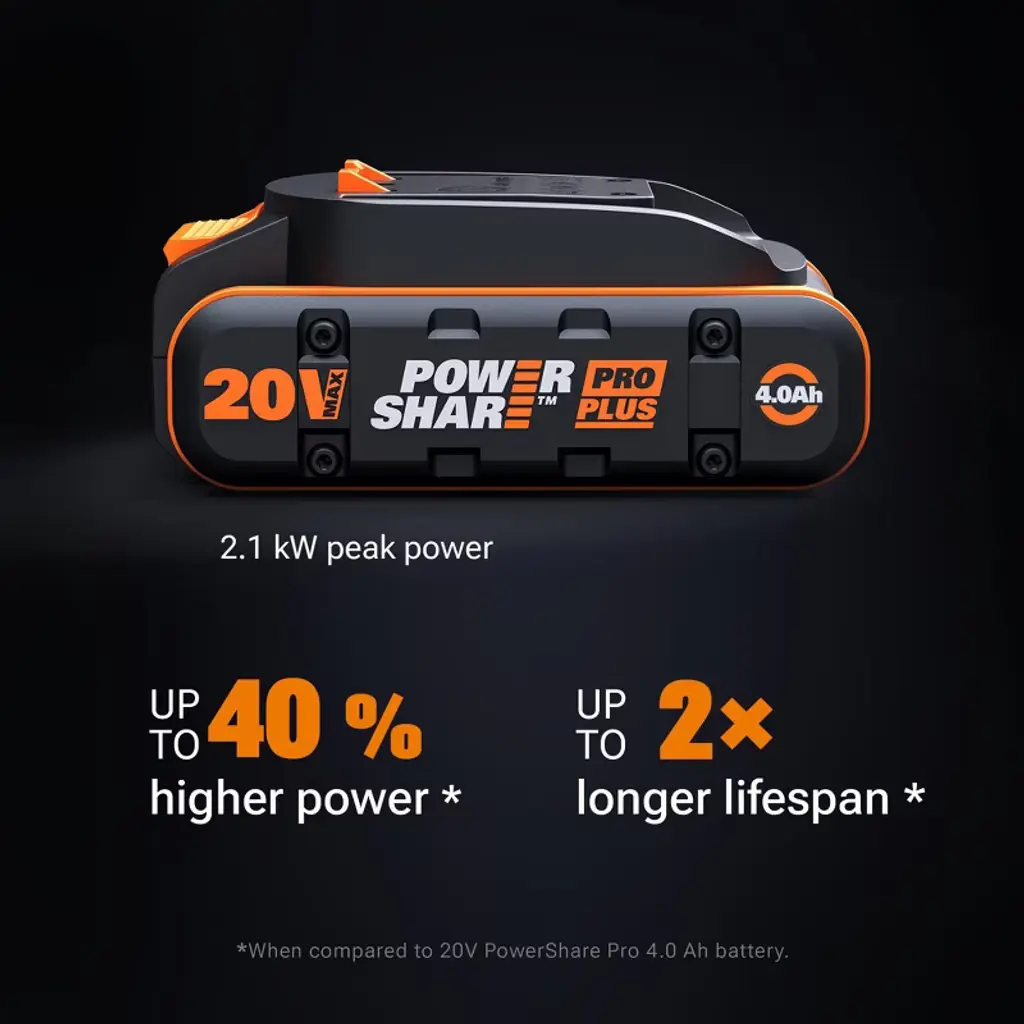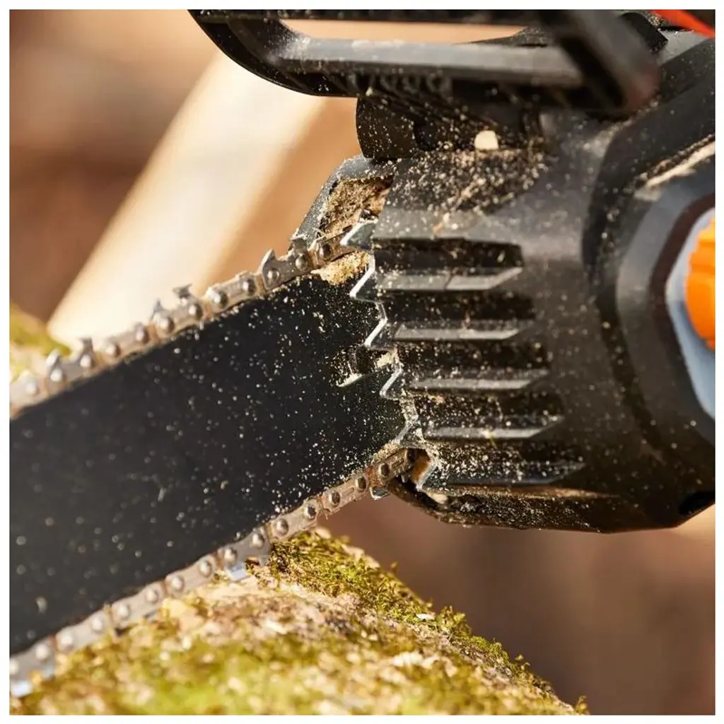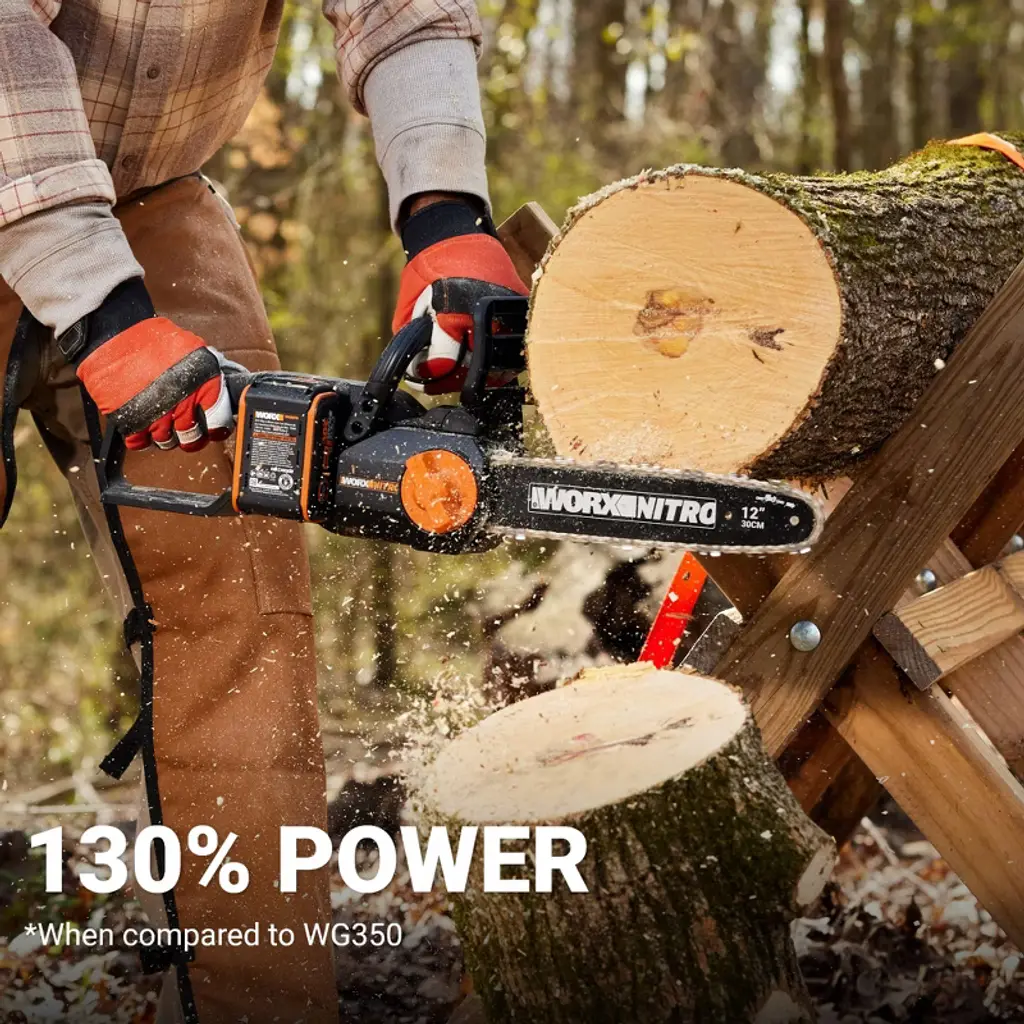 Tackle everyday cutting and trimming with confidence and convenience using the Worx Nitro 20V 12" Cordless Chainsaw. Backed by a high-efficiency brushless motor, this supercharged 20V battery cuts up to 2X more powerfully to its predecessor (WG322), effortlessly slices through trees and branches up to 10" in diameter without bogging down. Get more done in less time, as this battery operated chainsaw delivers rapid, productive cuts at up to 33 ft/s—2.6X that of the WG322 model. When used with a 4.0Ah Power Share PRO battery, this cordless chainsaw gets an extended runtime, allowing you to cut through up to 55 pcs of 4"x4" hardwood on a single charge. Those same batteries can also be used with 140+ power tools, outdoor equipment, and various lifestyle products that are all part of the of the innovative, eco-friendly Power Share platform by Worx. With automatic lubrication, the chain stays perfectly oiled without you needing to worry about it, providing smooth and efficient cutting, while also prolonging the bar & chain life. Adjusting your battery powered chainsaw chain is just as easy. The tool-free chain tensioning and replacement system is designed to save you time and effort. Simply turn a knob clockwise to achieve perfect chain tension without overtightening. Or turn it counterclockwise to replace the chain without any need for tools. Bucking logs is a breeze with this 12" battery chainsaw, thanks to its metal bucking spikes. They ensure smooth penetration into wood, boosting stability for secure and controlled cuts. Gain even more control and comfort on tough tasks with the soft-grip handle featuring rubberized microtexture. This chainsaw offers superior safety. Its quick-stop chain brake immediately springs into action if kickback occurs to help prevent injury. Plus, the added two-stage trigger prevents accidental starts, offering additional peace of mind.