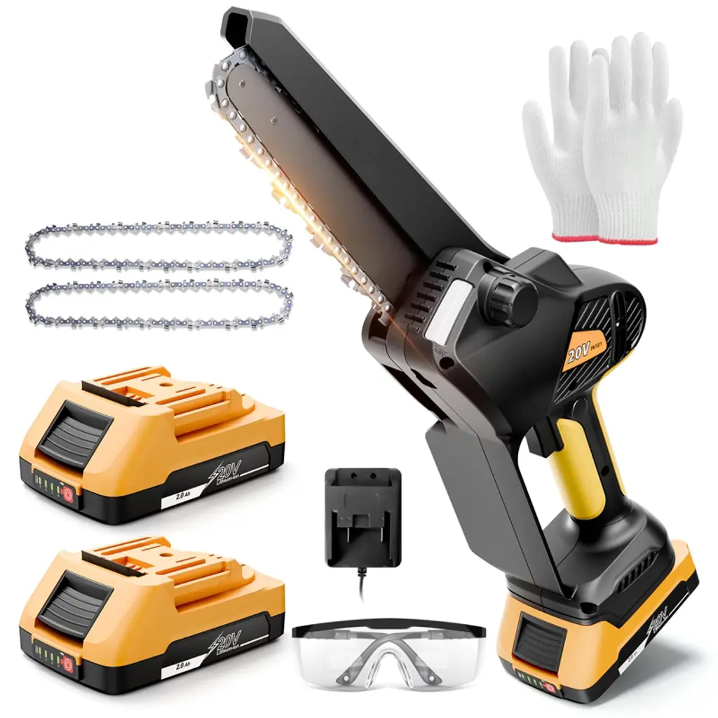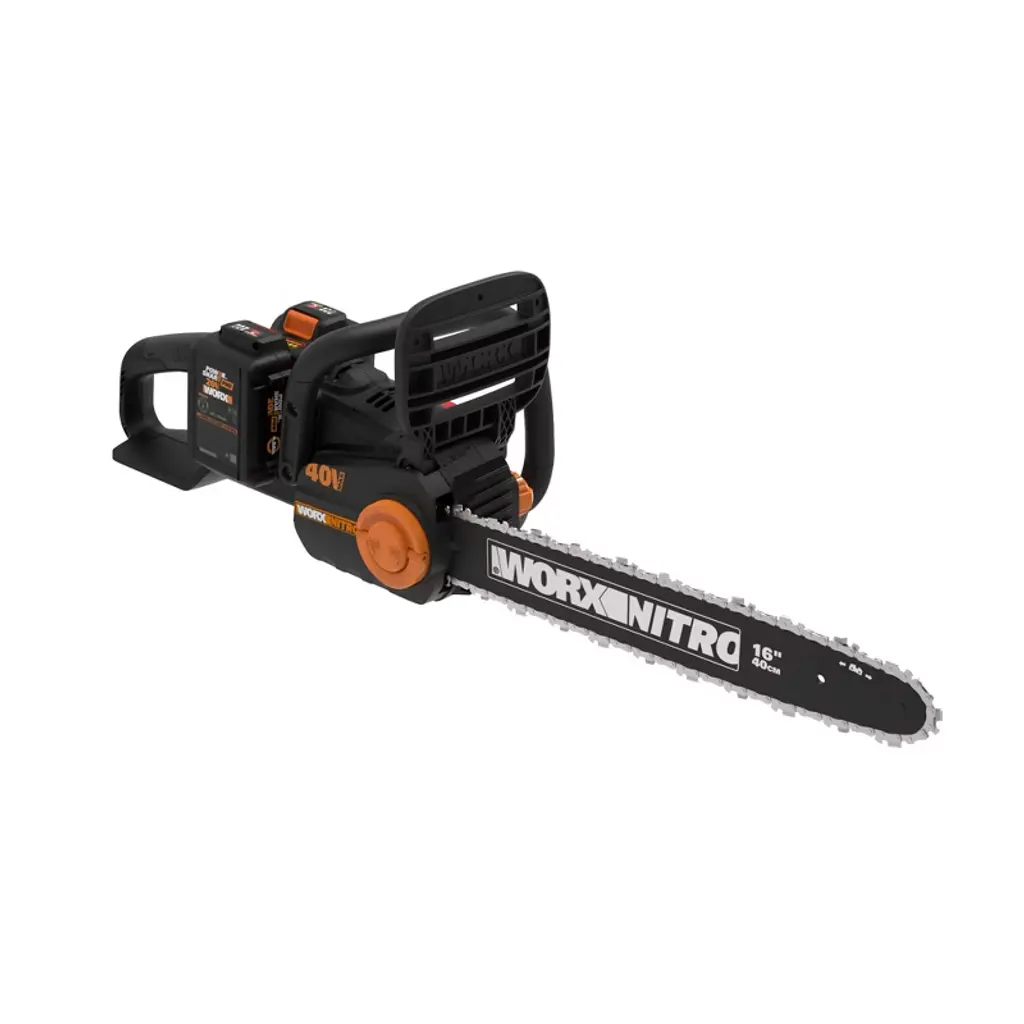 Tackle everyday cutting and trimming with confidence and convenience using the Worx Nitro 20V 12" Cordless Chainsaw. Backed by a high-efficiency brushless motor, this supercharged 20V battery cuts up to 2X more powerfully to its predecessor (WG322), effortlessly slices through trees and branches up to 10" in diameter without bogging down. Get more done in less time, as this battery operated chainsaw delivers rapid, productive cuts at up to 33 ft/s—2.6X that of the WG322 model. When used with a 4.0Ah Power Share PRO battery, this cordless chainsaw gets an extended runtime, allowing you to cut through up to 55 pcs of 4"x4" hardwood on a single charge. Those same batteries can also be used with 140+ power tools, outdoor equipment, and various lifestyle products that are all part of the of the innovative, eco-friendly Power Share platform by Worx. With automatic lubrication, the chain stays perfectly oiled without you needing to worry about it, providing smooth and efficient cutting, while also prolonging the bar & chain life. Adjusting your battery powered chainsaw chain is just as easy. The tool-free chain tensioning and replacement system is designed to save you time and effort. Simply turn a knob clockwise to achieve perfect chain tension without overtightening. Or turn it counterclockwise to replace the chain without any need for tools. Bucking logs is a breeze with this 12" battery chainsaw, thanks to its metal bucking spikes. They ensure smooth penetration into wood, boosting stability for secure and controlled cuts. Gain even more control and comfort on tough tasks with the soft-grip handle featuring rubberized microtexture. This chainsaw offers superior safety. Its quick-stop chain brake immediately springs into action if kickback occurs to help prevent injury. Plus, the added two-stage trigger prevents accidental starts, offering additional peace of mind.