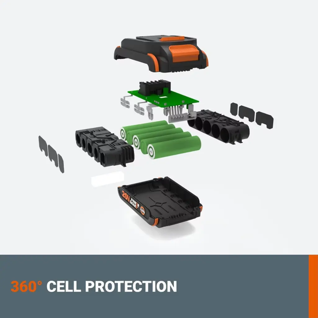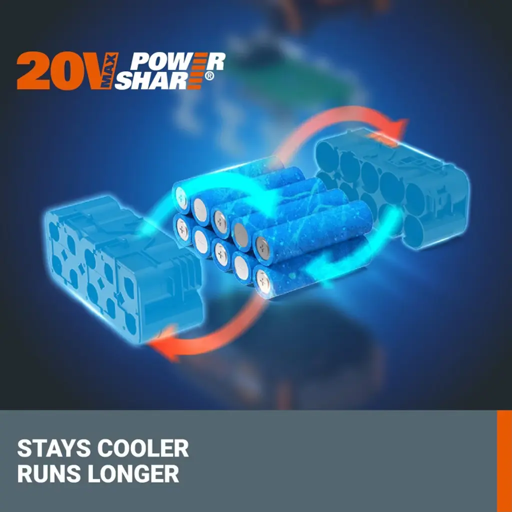 You can run your entire Worx Power Share collection of tools on this one 20V 2.0 Ah Max Lithium-Ion Battery. String trimmers and impact drivers, circular saws and lawnmowers, Hydroshots and leaf blowers, the list goes on and on. These batteries are lighter, which makes the tool lighter, and more efficient, than rechargeable batteries based on older designs. Max L-ion batteries don’t wane or drain, and won’t suffer from the memory effect that prevented last generation’s batteries from fully charging as they got older. Plus, they just last longer, so they’ll save you money. You can buy less of them because you can share each one between multiple tools. Cordless tools are much more cost-effective than gas, and you won’t have to worry about getting snagged on a cord. 40V Power Share tools run on this battery too, you just need two of them (20V + 20V = 40V). They provide gas-like power and performance without all the drawbacks of gasoline: no fumes, no mess, no paying at the pump. Depending on the task, and the tool, these batteries will have different runtimes, but a good rule of thumb is that one 20V 2.0 Ah battery will provide enough charge to power our Worx GT String Trimmer/Edger/Mini-Mower through an average 1/4 acre lawn. This battery is compatible with the following chargers (not included): WA3742, WA3868 quick charger, WA3875 dual-port charger, WA3878 quick dual-port charger.