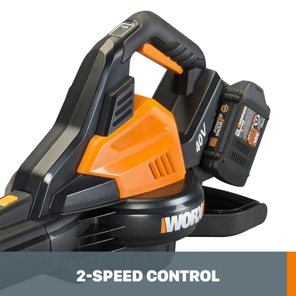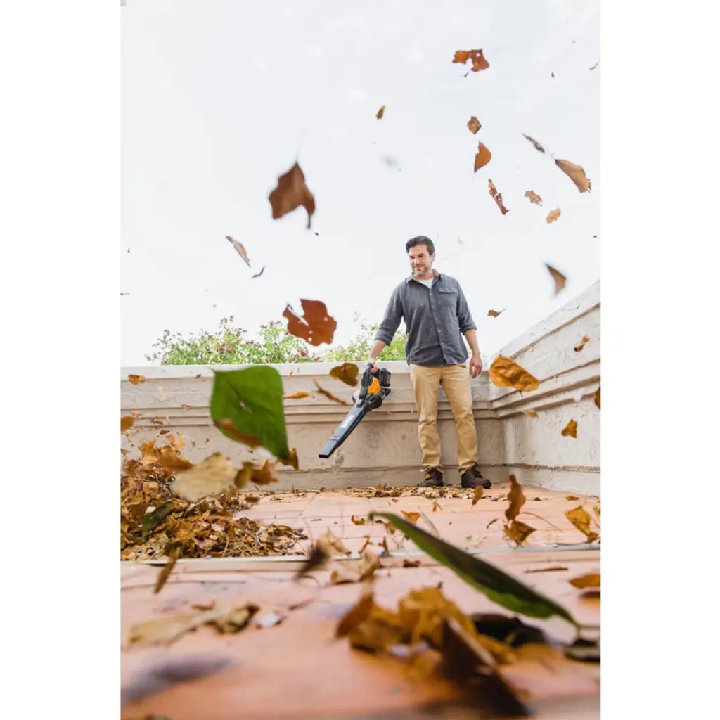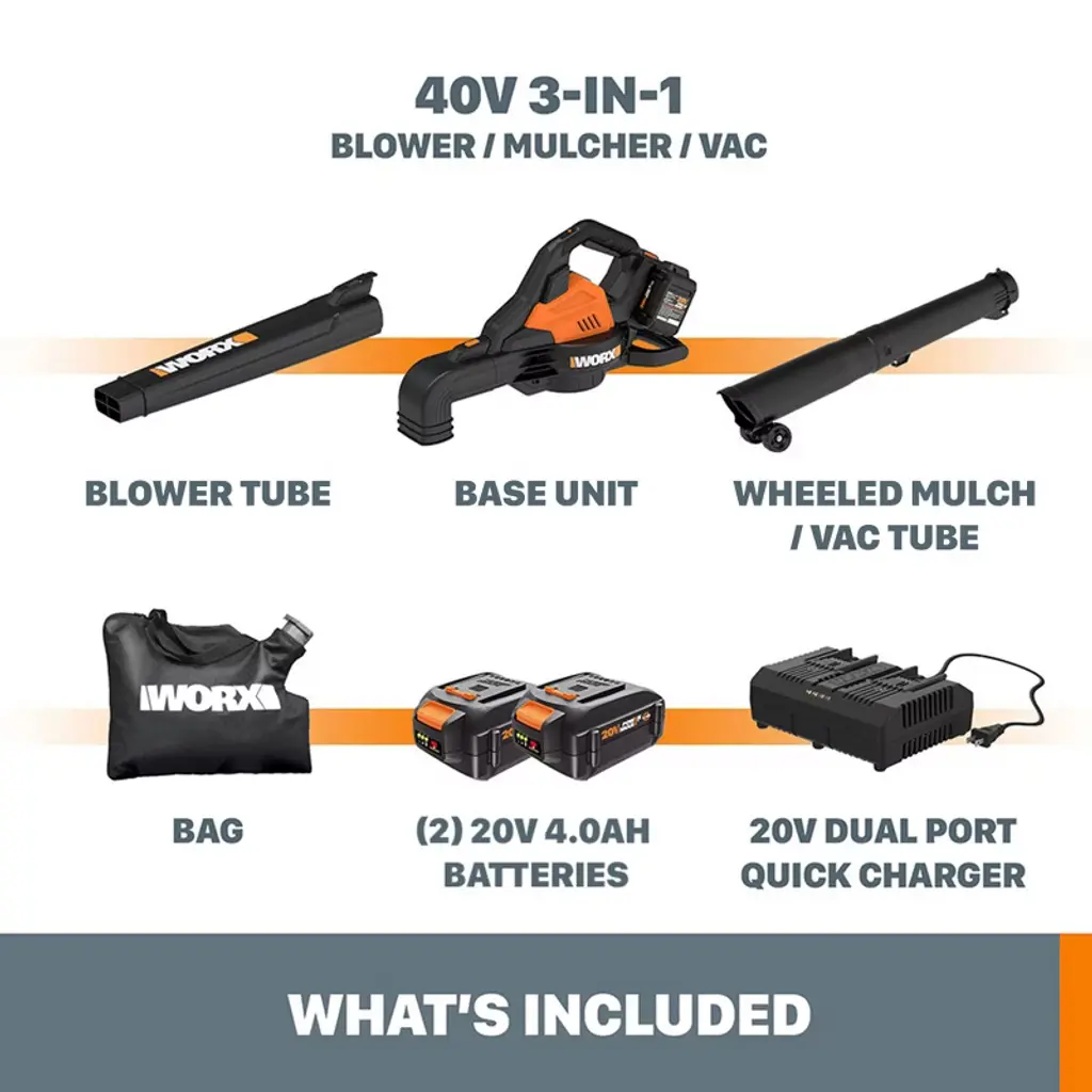 LEAF BLOWER, LEAF MULCHER AND LEAF VACUUM IN ONE! The Worx WG583 40V Power Share Cordless Blower, Vac and Mulcher has three times the functionality of your everyday leaf blower and twice the performance. This 3-in-1 leaf blower vacuum and mulcher uses two 20V batteries and a high-efficiency brushless motor to drive this enormously useful yard clearing system. Gone are the days of raking all the leaves in the yard into piles, then stuffing those piles into bags, then taking those bags to the curb or a disposal site. This leaf blower mulcher blows all the leaves into piles with much less work than using a rake. Then its one-touch tool-less change system turns this leaf blower into a leaf vacuum so you can suck them all up. Then the leaf mulcher functionality chops them down into 1/12th their original size, so instead of having 12 bags of yard debris, you only have one! It takes a chore that used to take all day and chops it down into a much quicker task. This leaf blower vacuum pumps out 350 CFM on high and 200 CFM on low, at 185 or 116 MPH for an impressive amount of air volume when in its leaf blower mode. It weighs only 8.4 lbs. (5.5 lbs. bare) in leaf blower mode, and just 11.5 lbs. (8.6 lbs. bare) in leaf vacuum mode. Plus, there’s no cord to trip over. All this leaf munching functionality is lightweight and very mobile—ergonomically designed to be the perfect leaf blower vacuum and mulcher.