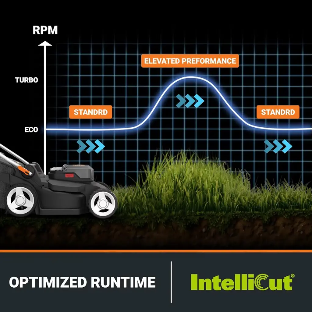 Experience efficient mowing with the WORX 40V 17" brushless push lawn mower, ideal for mowing yards up to 1/4 acre without costs and hassles of gas. The cordless lawn mower powered by (2) included 20V 4.0Ah Power Share batteries, which can be quickly recharged with the included dual charger. Batteries are compatible with 140+ power tools, outdoor power equipment, and lifestyle products of the WORX Power Share platform, making it easier for you to use the power source. With Intellicut technology, the battery lawn mower optimizes runtime by automatically adjusting cutting speed to fit grass conditions. 17" deck with 6-height adjustments ensures a perfect cut from 1.5" to 4". Weighing only 40 LBS, it's easy to maneuver and transport. An onboard charge indicator shows remaining power, so you know when to recharge. Cut the way you want with 2-in-1 mulching/bagging—use the mulch plug to leave clippings on your grass as natural nourishment or use the collection bag to simplify cleanup.