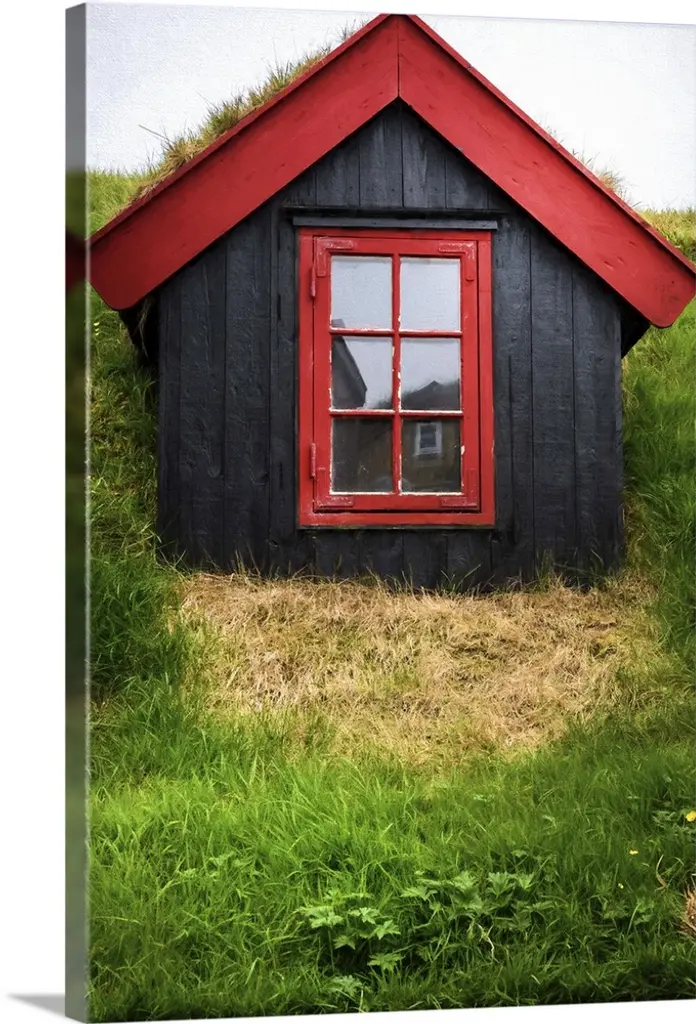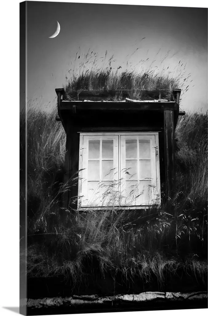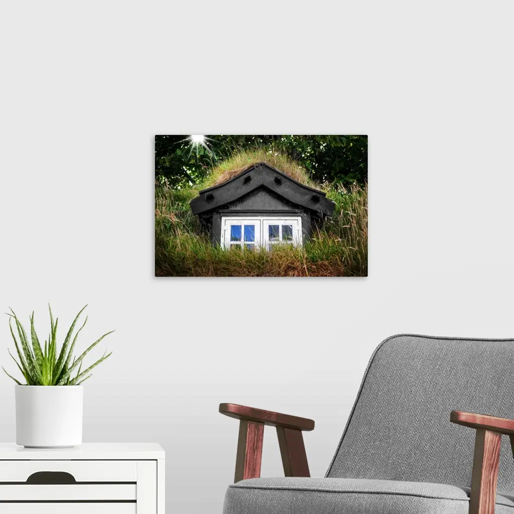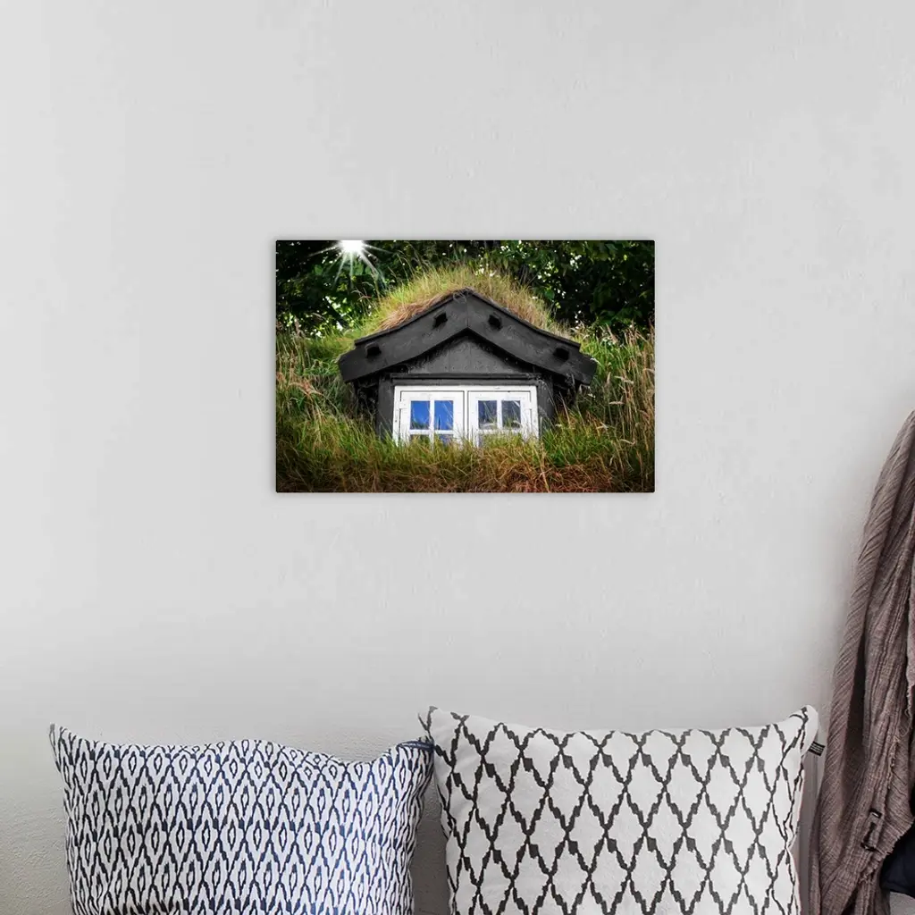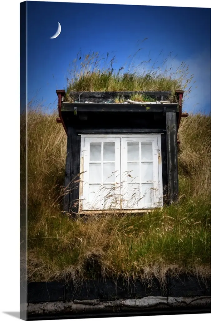 Sunlight shining over a window in the grassy roof of a house.