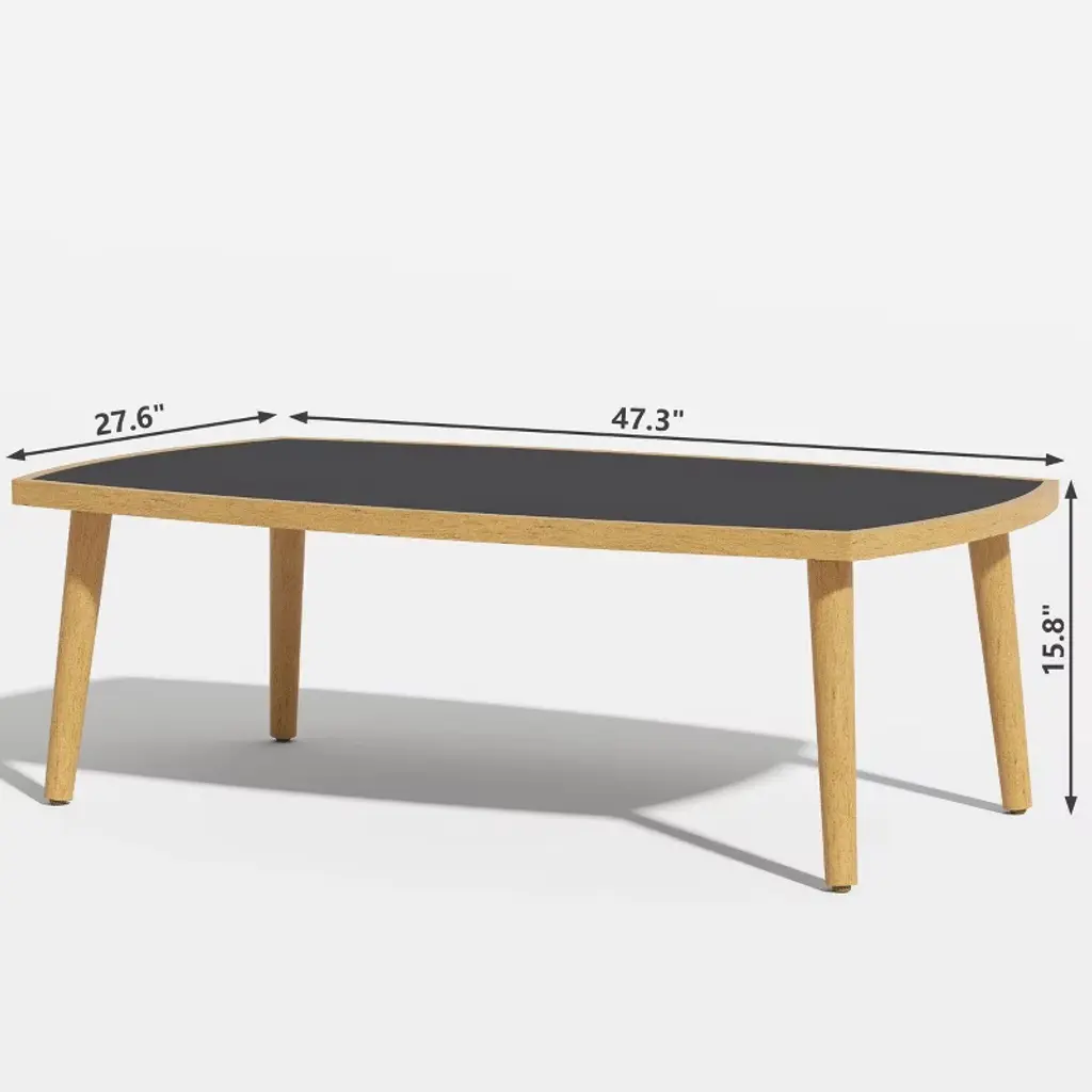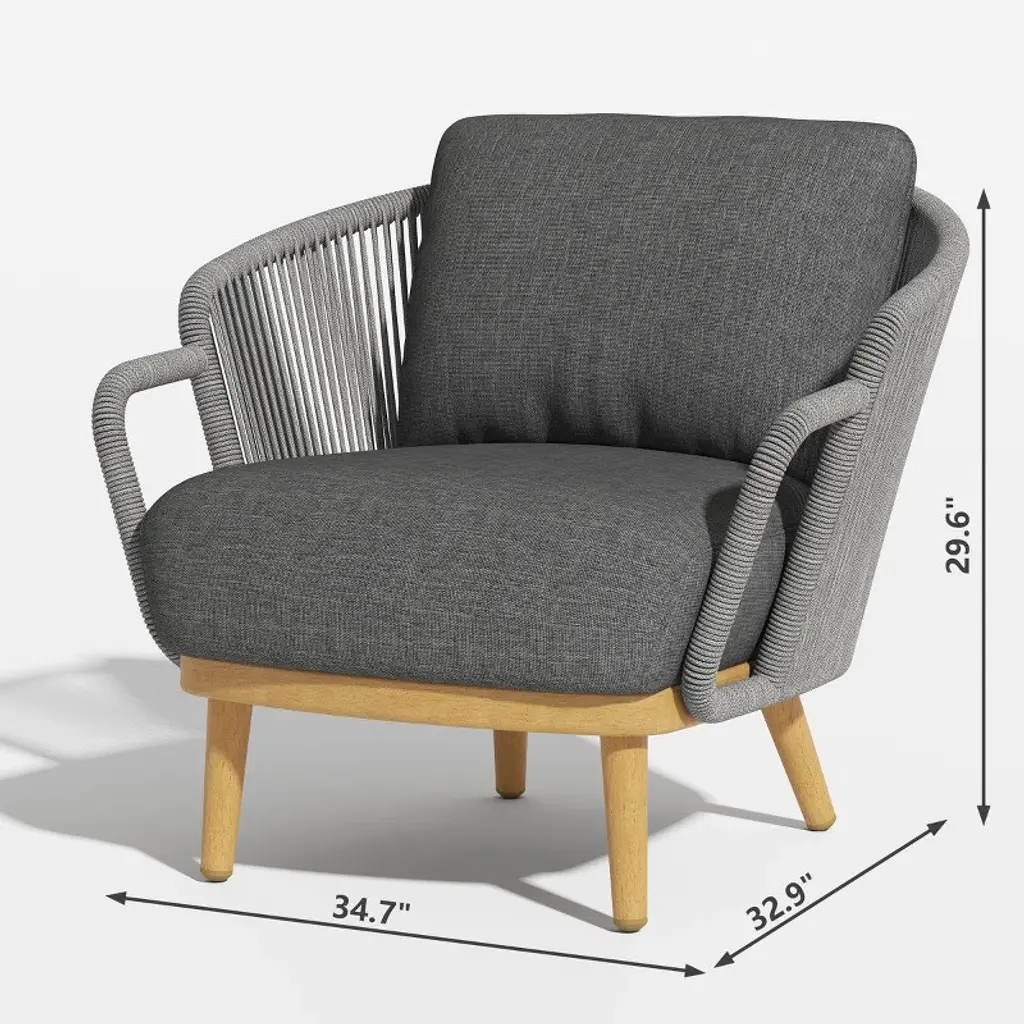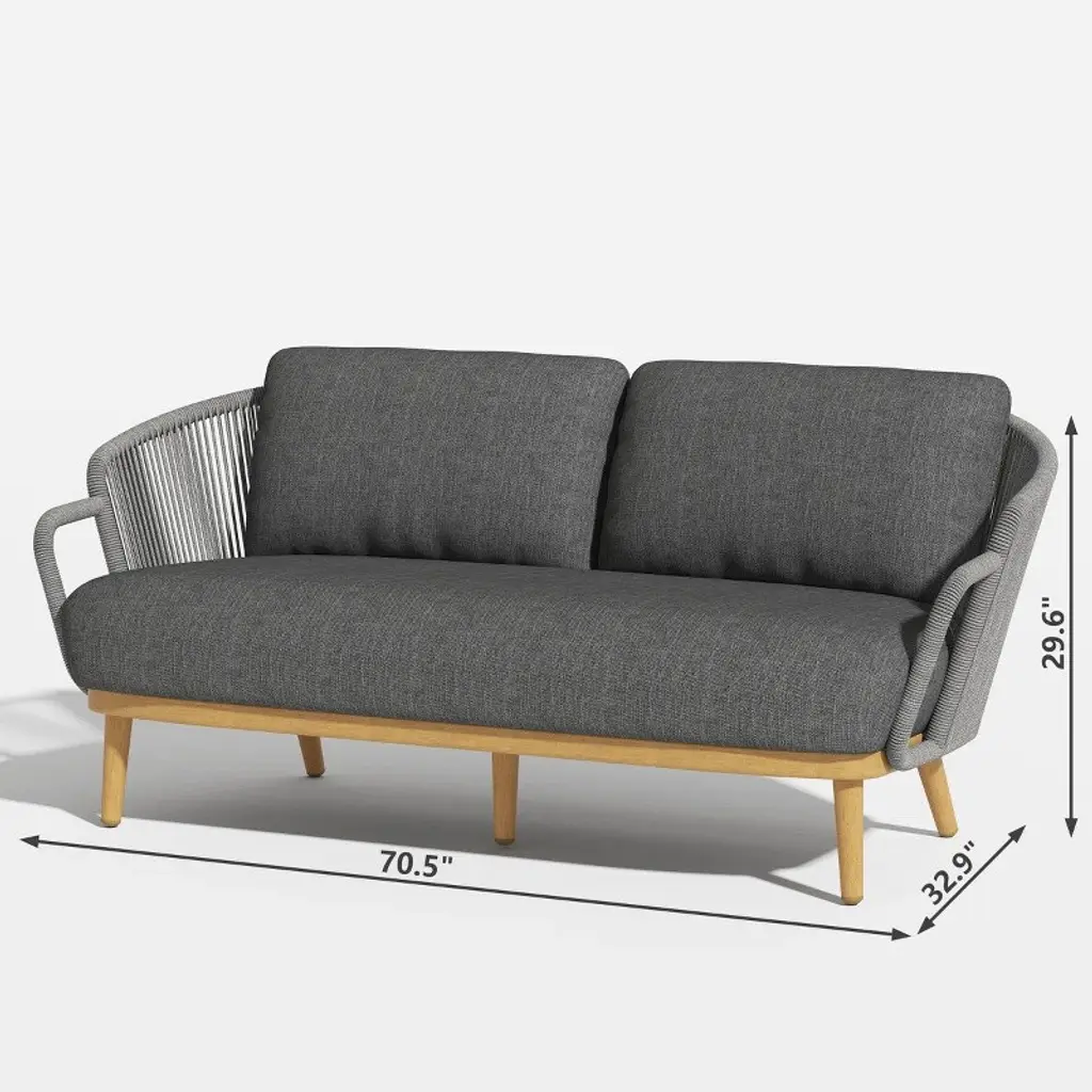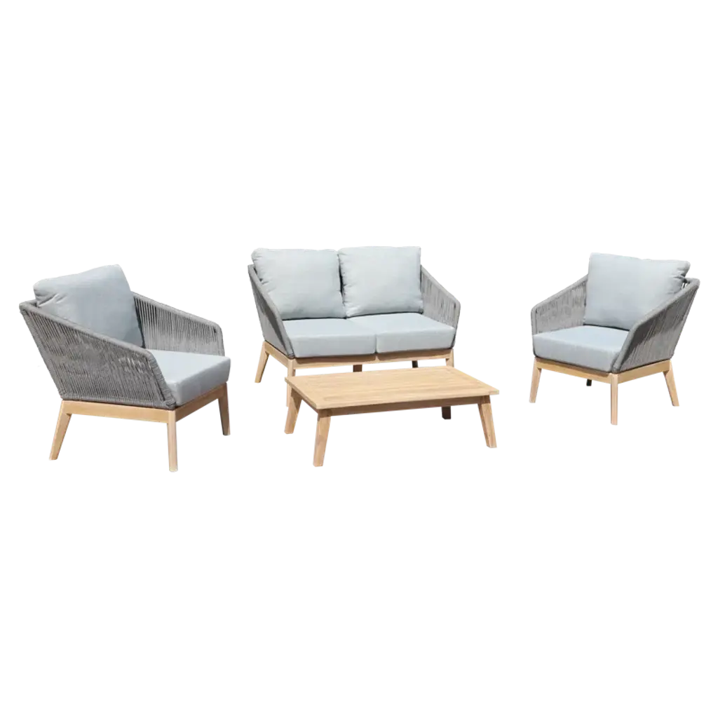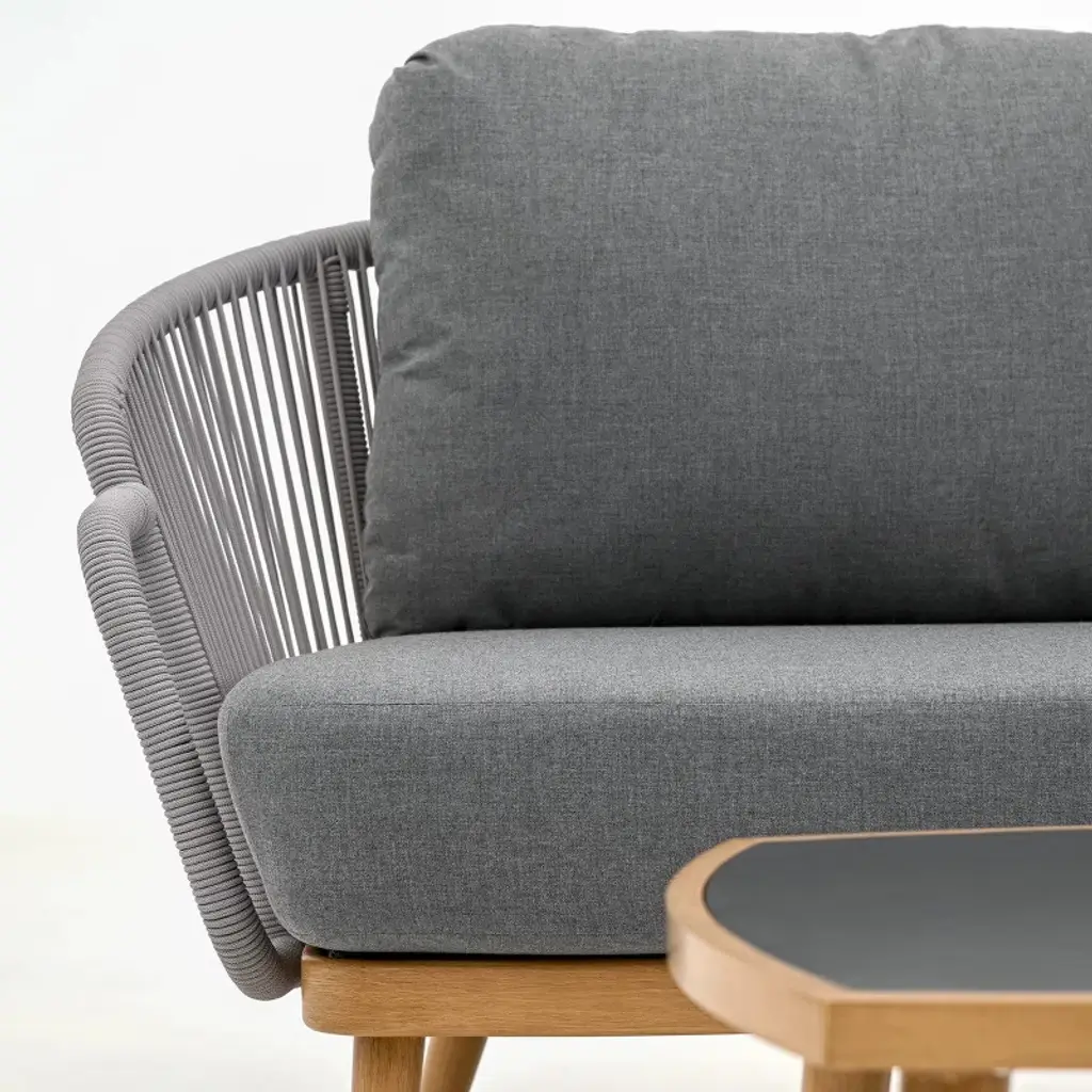 Complete your patio sanctuary with this coordinated set featuring a twoseater sofa, two armchairs, and rectangular glasstop coffee table. Sustainably sourced timber frames offer natural resilience, supporting performance knit cushions designed for enhanced airflow and comfort. Intricate ropetextured backrests merge contemporary styling with organic tactility. The centerpiece table showcases toughened glass over timber legs, engineered for stability on uneven surfaces.