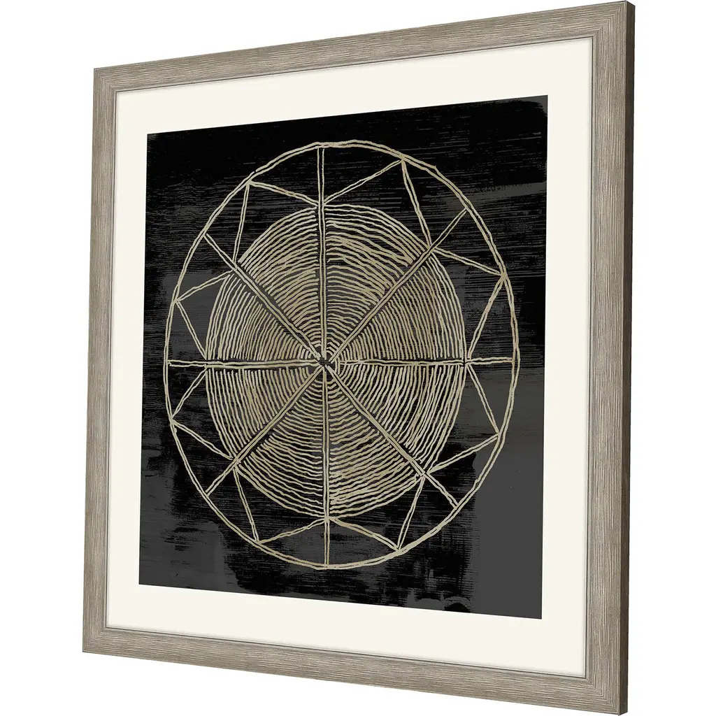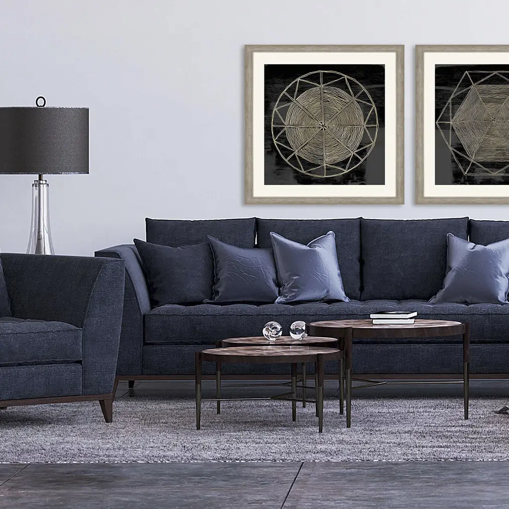 Geometric shapes pop against a black background. Matted in putty and framed in distressed silver finish moulding.