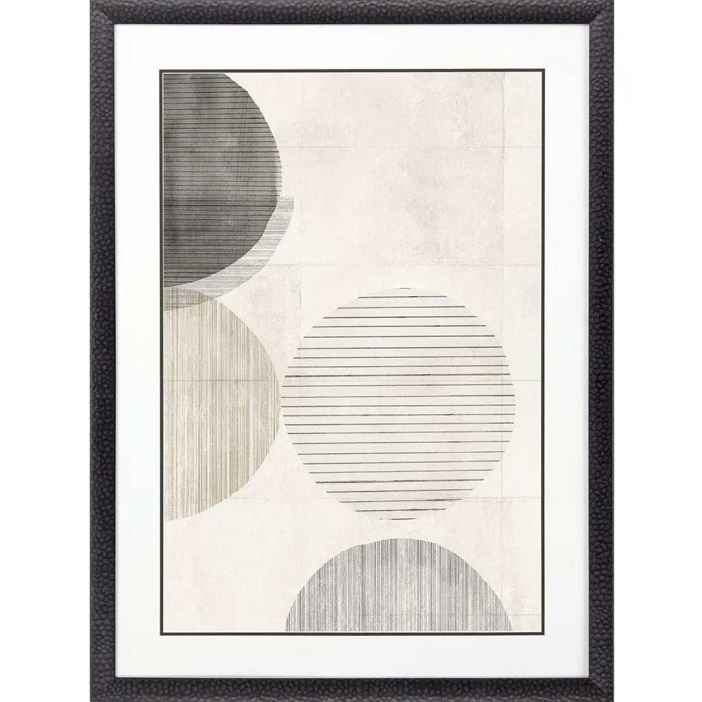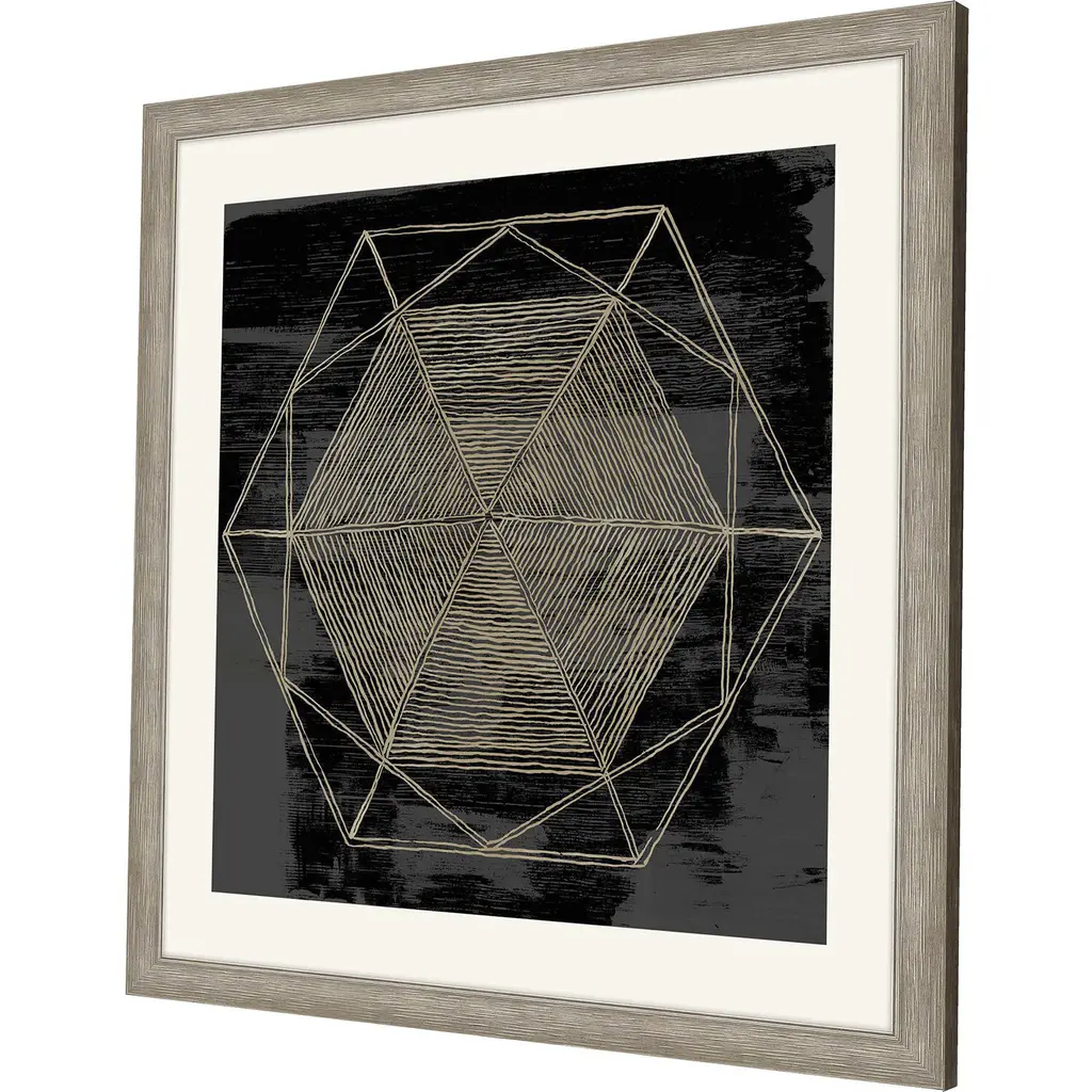 Geometric shapes pop against a black background. Matted in putty and framed in distressed silver finish moulding.