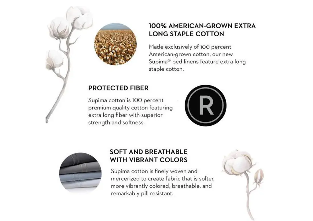 Made exclusively of 100 percent American-grown extra-long staple cotton, this makes our new Supima sheets the perfect premier sheeting option for your store. Featuring a lustrous sateen weave, these new 600-thread-count sheets drape beautifully. Supima cotton is finely woven and mercerized to create fabric that is softer, more vibrantly colored, breathable, and remarkably pill resistant. Crafted with extra-deep pockets for thicker and pillowtop mattresses, your customers will love our Universal Fit® guarantee. Unlike Egyptian cotton, which does not denote any quality attributes, Supima cotton is a protected and verified fiber. Our sheets are protected with a five-year warranty against manufacturer defects like piling, so your customers can purchase with confidence.