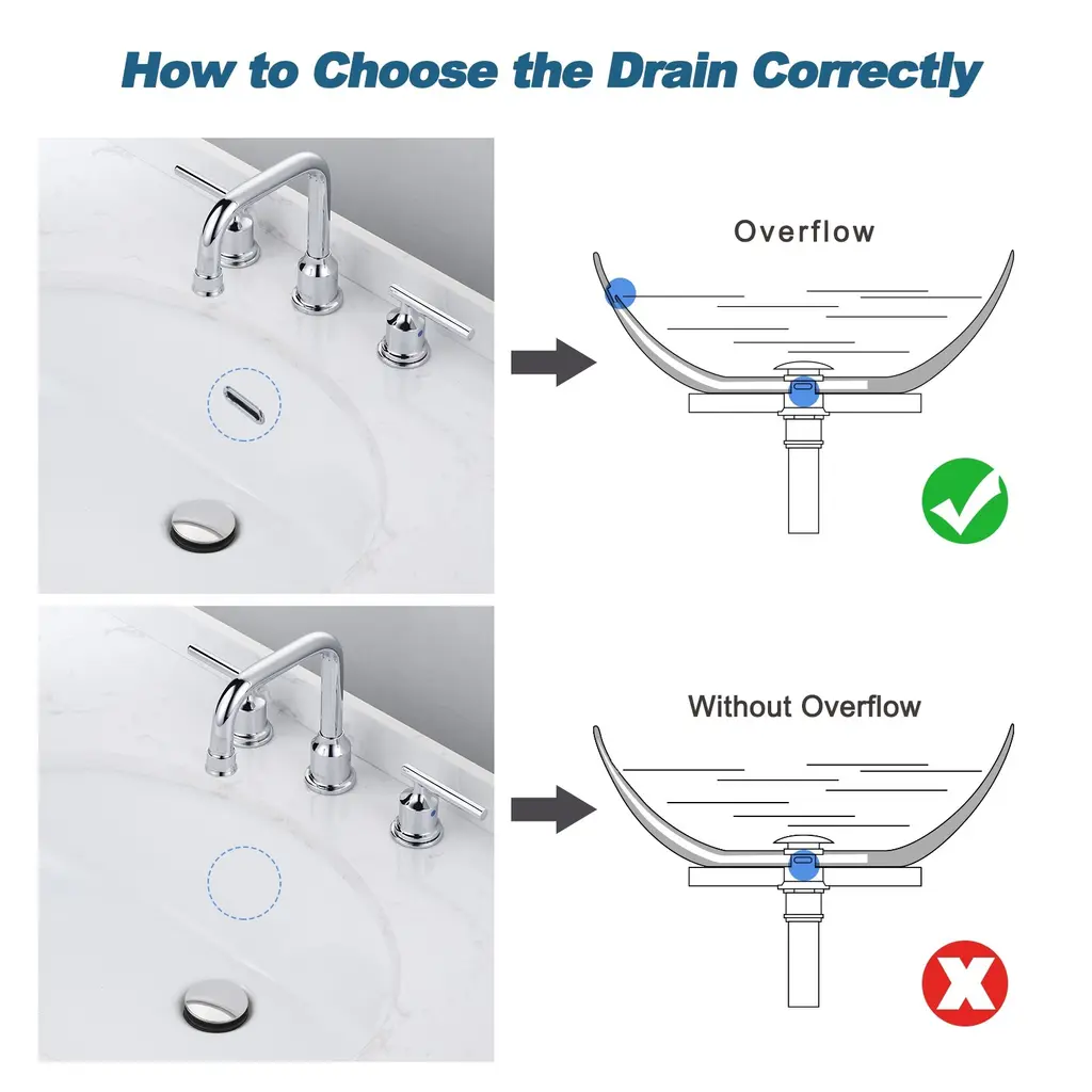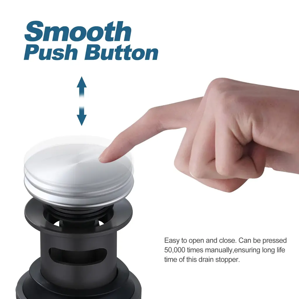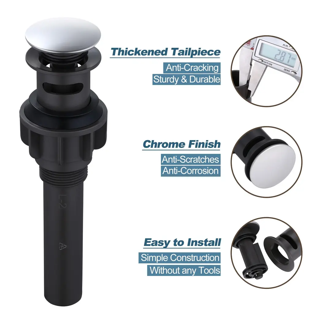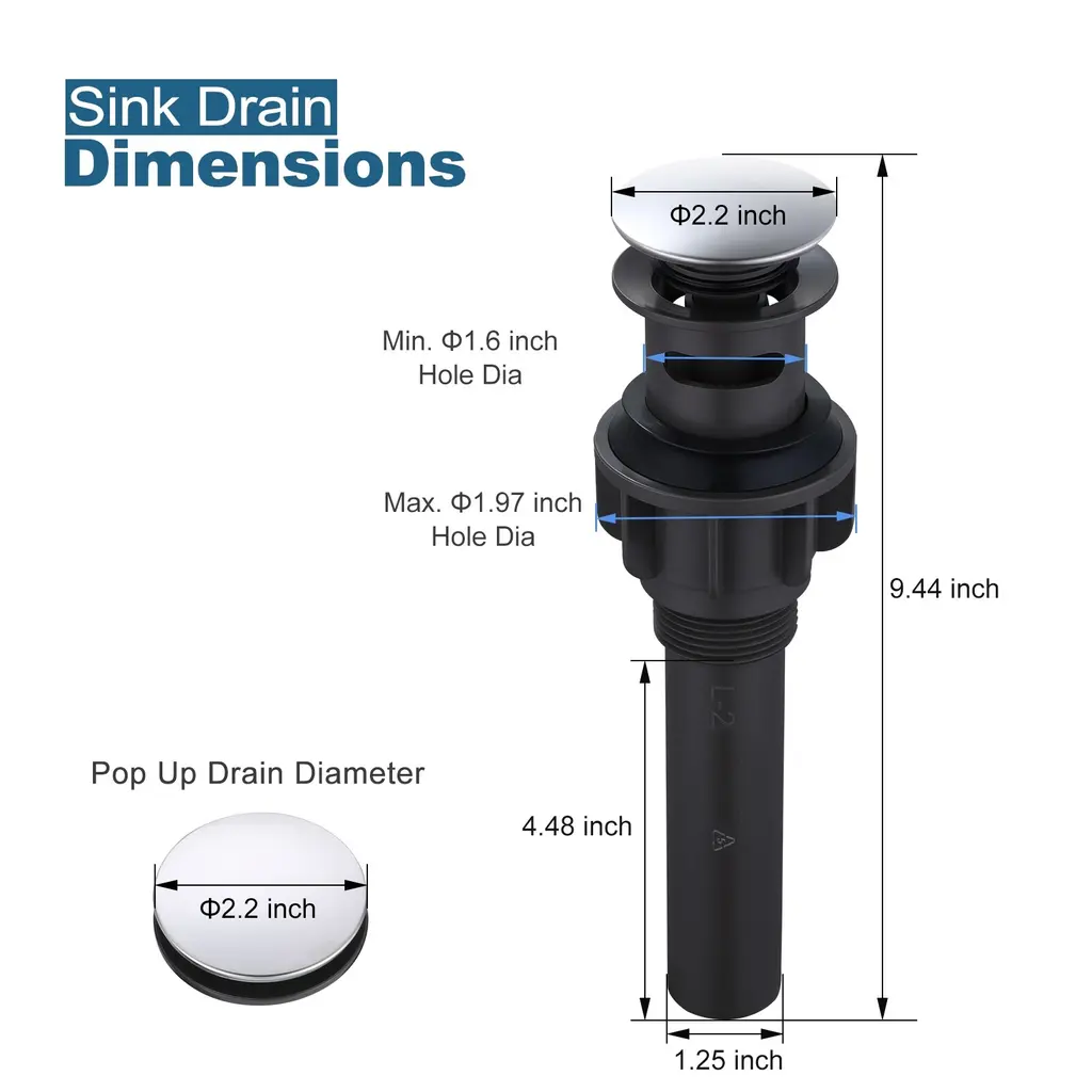 Overflow Design Wash basin with overflow hole, choose our drainer with overflow hole. Note: With overflow fits bathroom vanity sink with a drain hole diameter of 1-1/2 in. or 1-3/4 in. Detail Size Diameter of the Pop-Up Cap:2.2 in. Height (Pop Up Close): 8.66 in. Height (Pop Up Open): 9.44 in. Fits Drain Hole Size: 1/2 in. - 1 3/4'' Max. Thickness: 1.9"Feature: