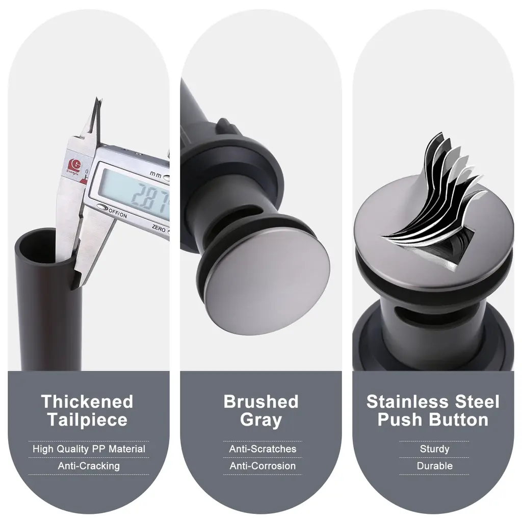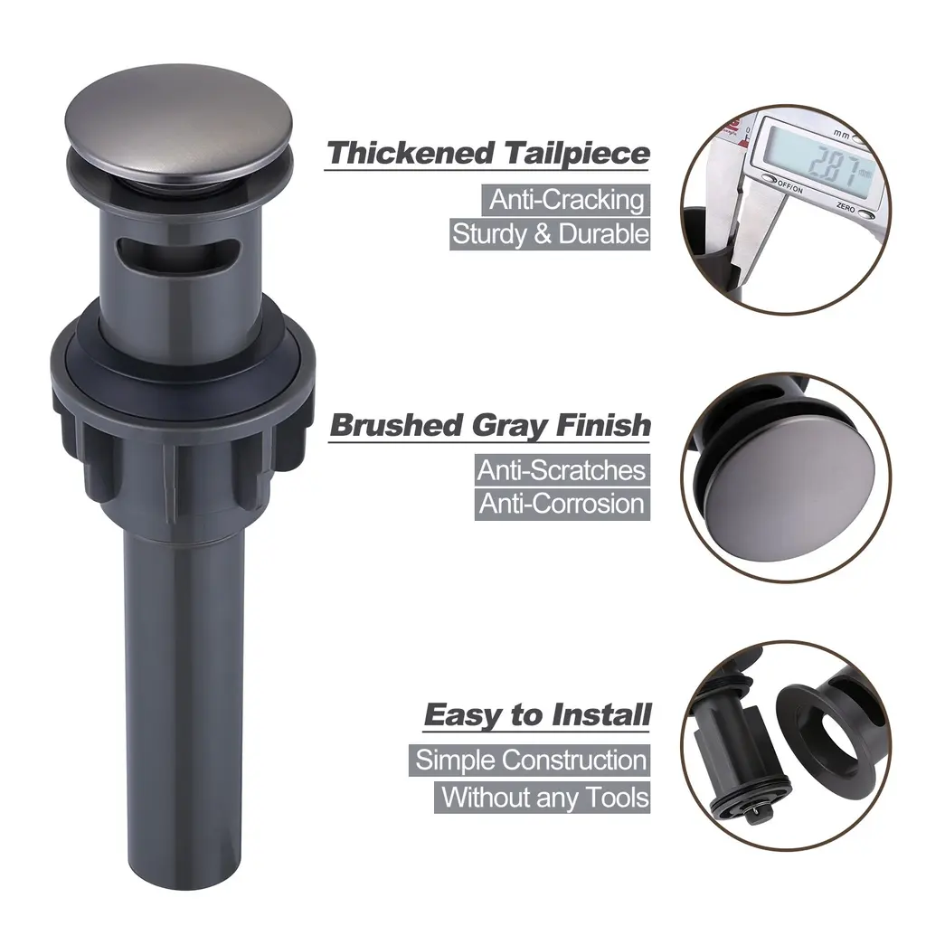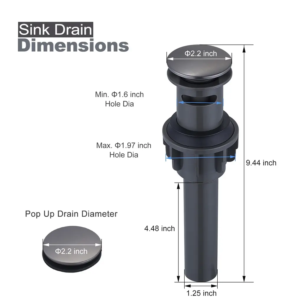 Overflow Design Wash basin with overflow hole, choose our drainer with overflow hole. Note: With overflow fits bathroom vanity sink with a drain hole diameter of 1-1/2 in. or 1-3/4 in. Detail Size Diameter of the Pop-Up Cap:2.2 in. Height (Pop Up Close): 8.66 in. Height (Pop Up Open): 9.44 in. Fits Drain Hole Size: 1/2 in. - 1 3/4'' Max. Thickness: 1.9"Feature: