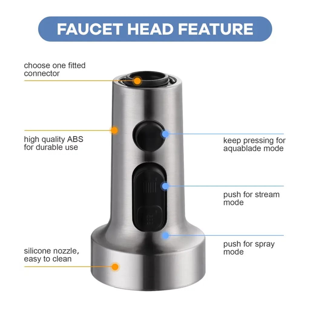 Introducing our versatile kitchen sprayer designed for durability and reliability. Made with high-quality materials, its sturdy construction prevents rust. With 3-spray patterns-stream, spray and aqua blade-you can effortlessly switch between tasks like rinsing dishes or filling pots. It comes with 9-adapters, the silicone nozzles are easy to clean, and the fine mesh aerator prevents splashing, shaping the water stream. Our versatile kitchen sprayer is easy to install with no specialized tools required.