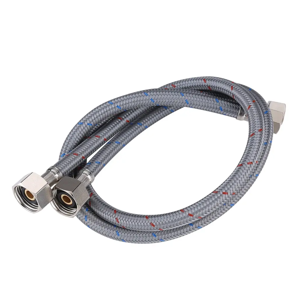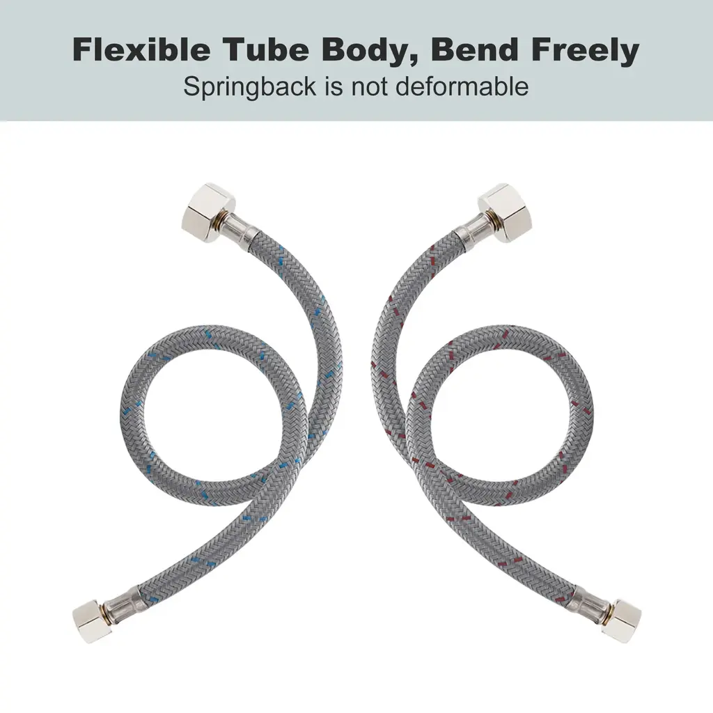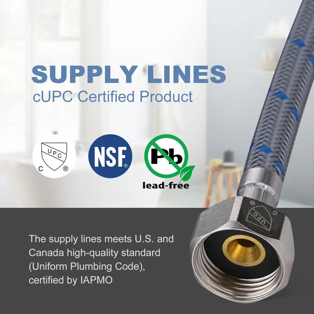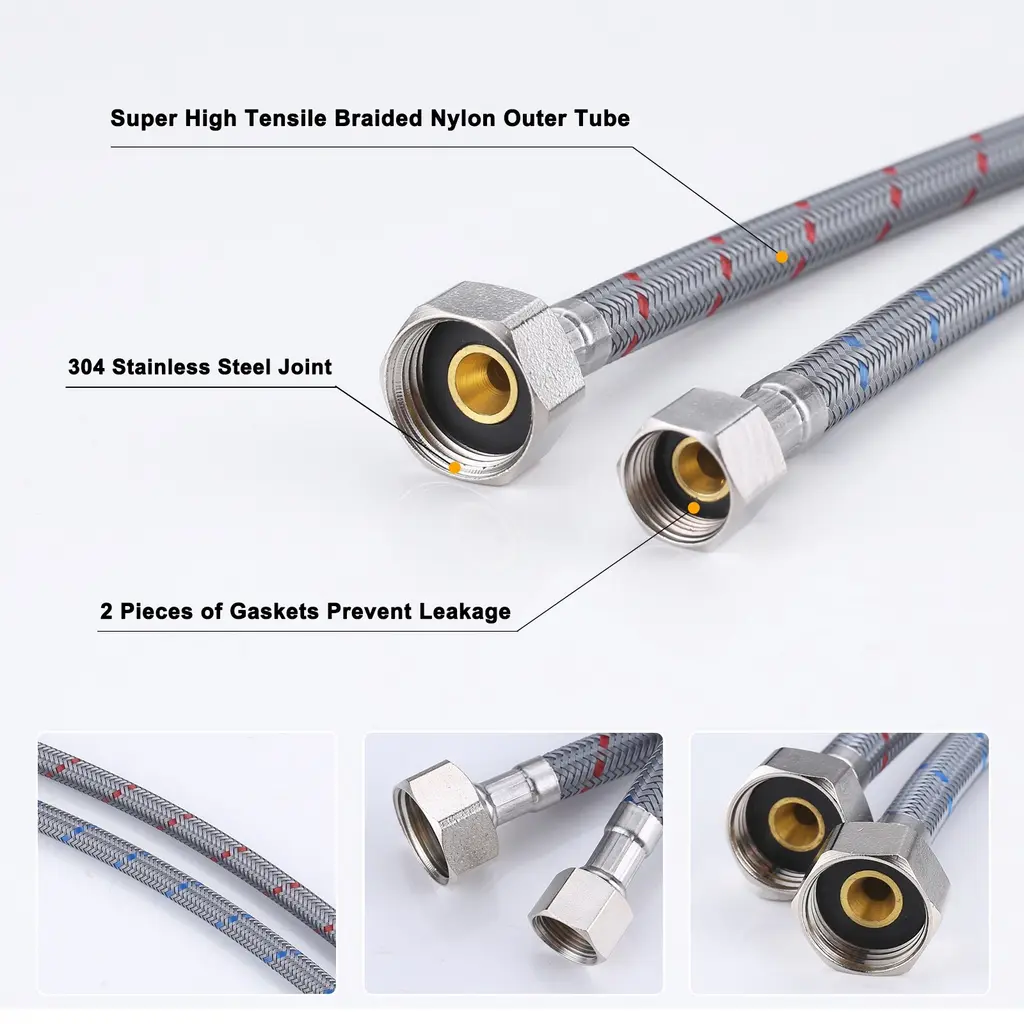 Feature 3/8 in. Female compression and 1/2 in. metal material nut, compatible with most Standard Size faucets. The faucet hose is made of superior quality braided nylon, resistant to corrosion and rust, and protects PEX inner tube, ensures maximum pressure and performance. The water supply lines feature a sealing washer, ensure no water leakage, solid metal material connector, ensure quality and longevity.