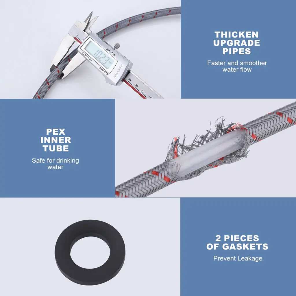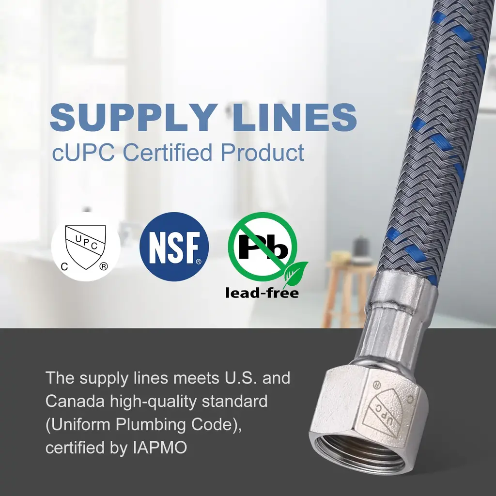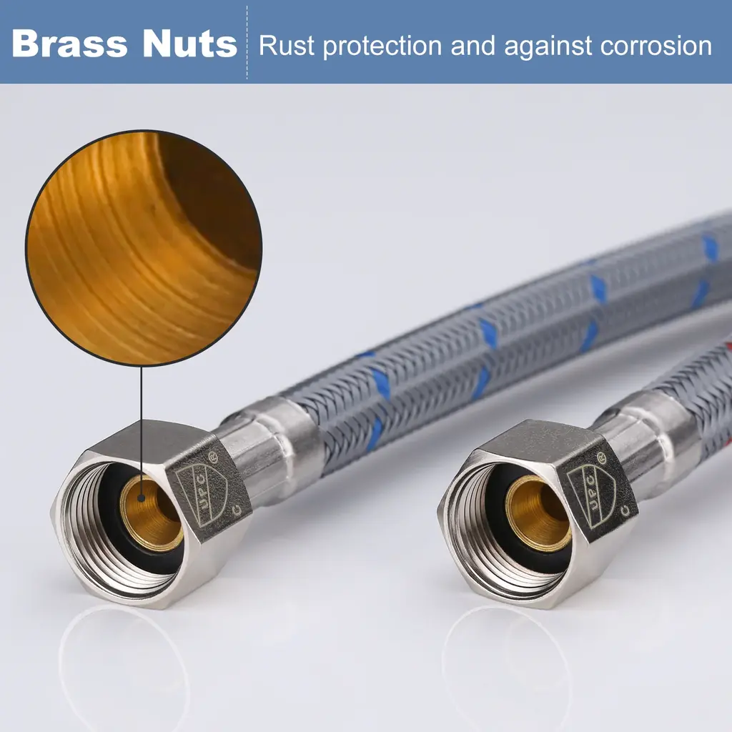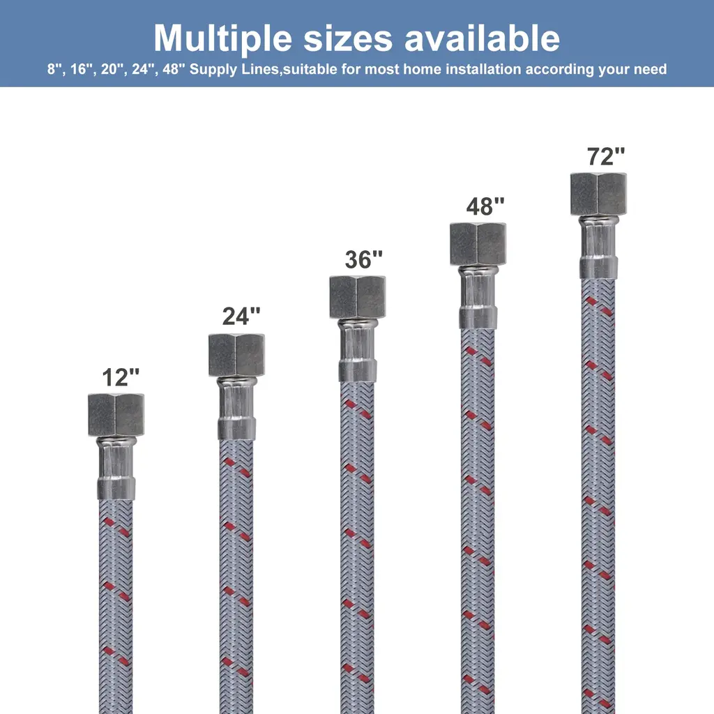 Feature 3/8 in. Female Compression and 3/8 in. Female Compression copper nut. Compatible with most Standard Size faucets. Supply for hot and cold water. The faucet hose is made of superior quality braided nylon, resistant to corrosion and rust, and protects PEX inner tube, ensures maximum pressure and performance. Never worry your hose will burst. Easy to install with simple tools within few minutes. No plumbers needed, flexible faucet supply hose is designed to prevent twining and crimping together. The water supply lines feature a sealing washer, ensure no water leakage, solid copper connector, ensure quality and longevity.Highlights