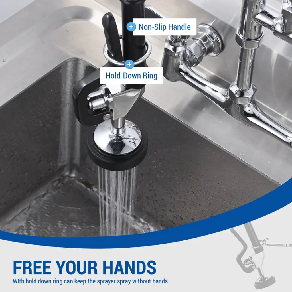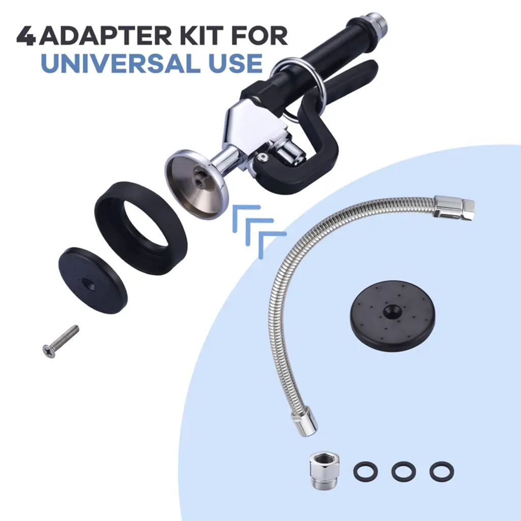 Efficient cleaning, spray and wipe for instant results. Durable 18.5 in. leak-proof hose made of flexible stainless steel with a 7/8 in. 20 UNEF threaded connection. Corrosion-resistant and long-lasting, it features a 2-mode high flow design with jet (1.3 GPM) and spray (3.85 GPM) options, interchangeable rubber nozzles for tackling various dirt types. User-friendly design includes a stainless steel ring for hands-free operation and non-slip rubber for enhanced stability. Easy installation with complete components, requiring no professional skills for hassle-free use.