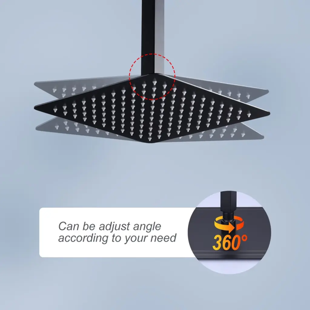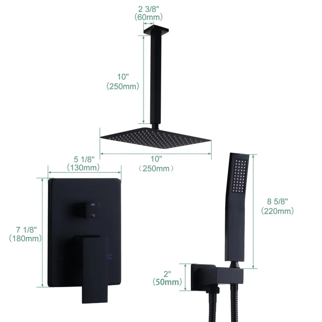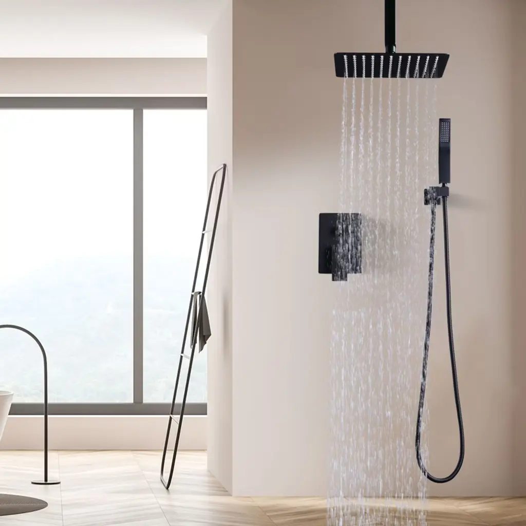 Indulge in the ultimate essence of relaxation with this Complete Shower System, an ideal complement to any contemporary bathroom setting. This shower faucet set includes a 10" ceiling-mounted rainfall showerhead and a flexible 70" handheld for personalized comfort. This shower head and handle set boasts a solid, all-metal construction. The mixing valve is crafted from solid brass, and the multi-layer plating ensures no rust and a long lifespan, providing durability in even the most humid environments. The shower top spray rotates 360 degrees, and the 304 stainless steel rain head with silicone nozzles easily wipes away mineral deposits.