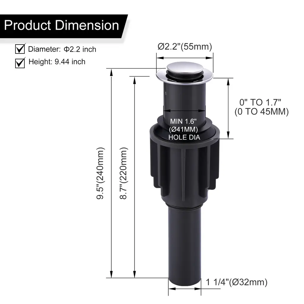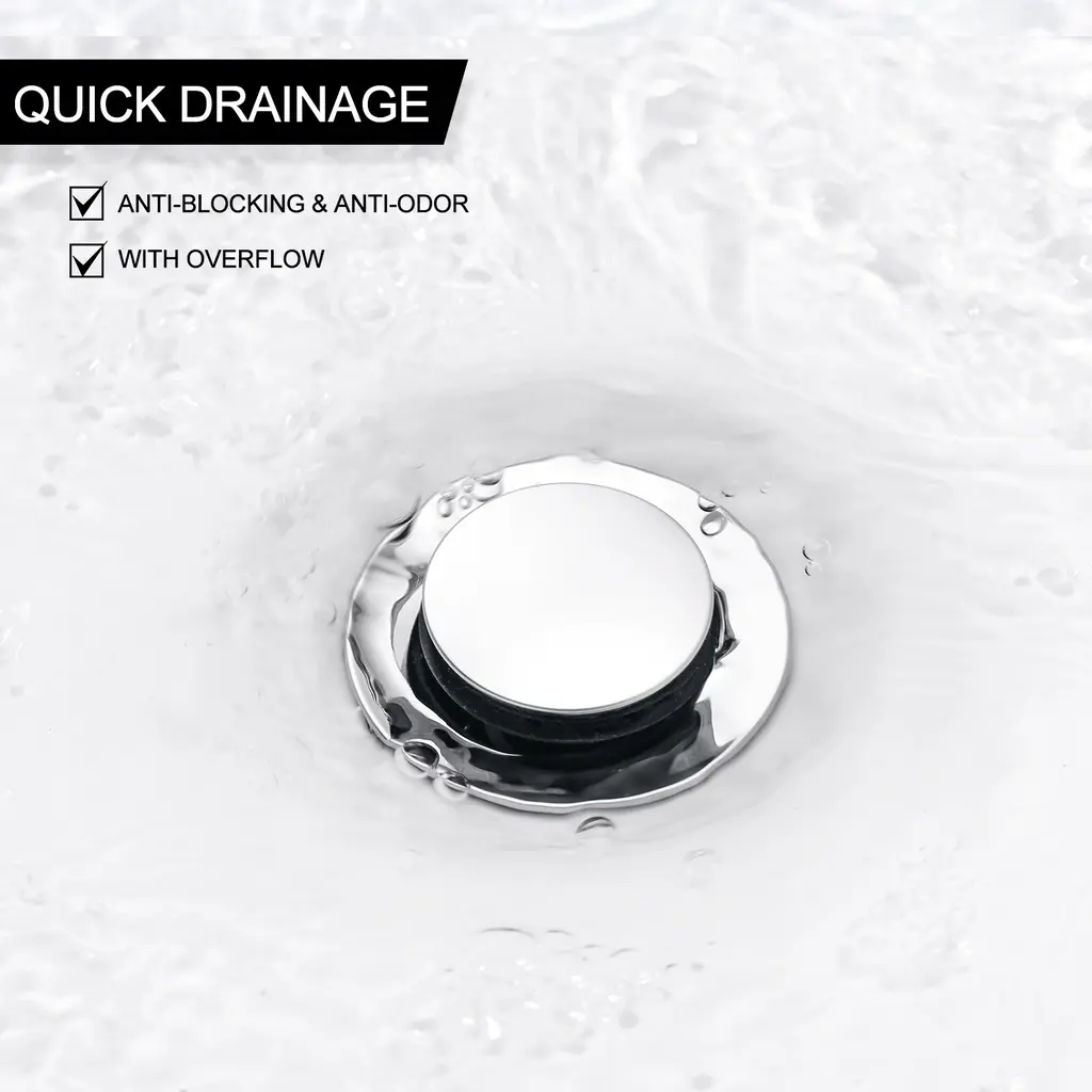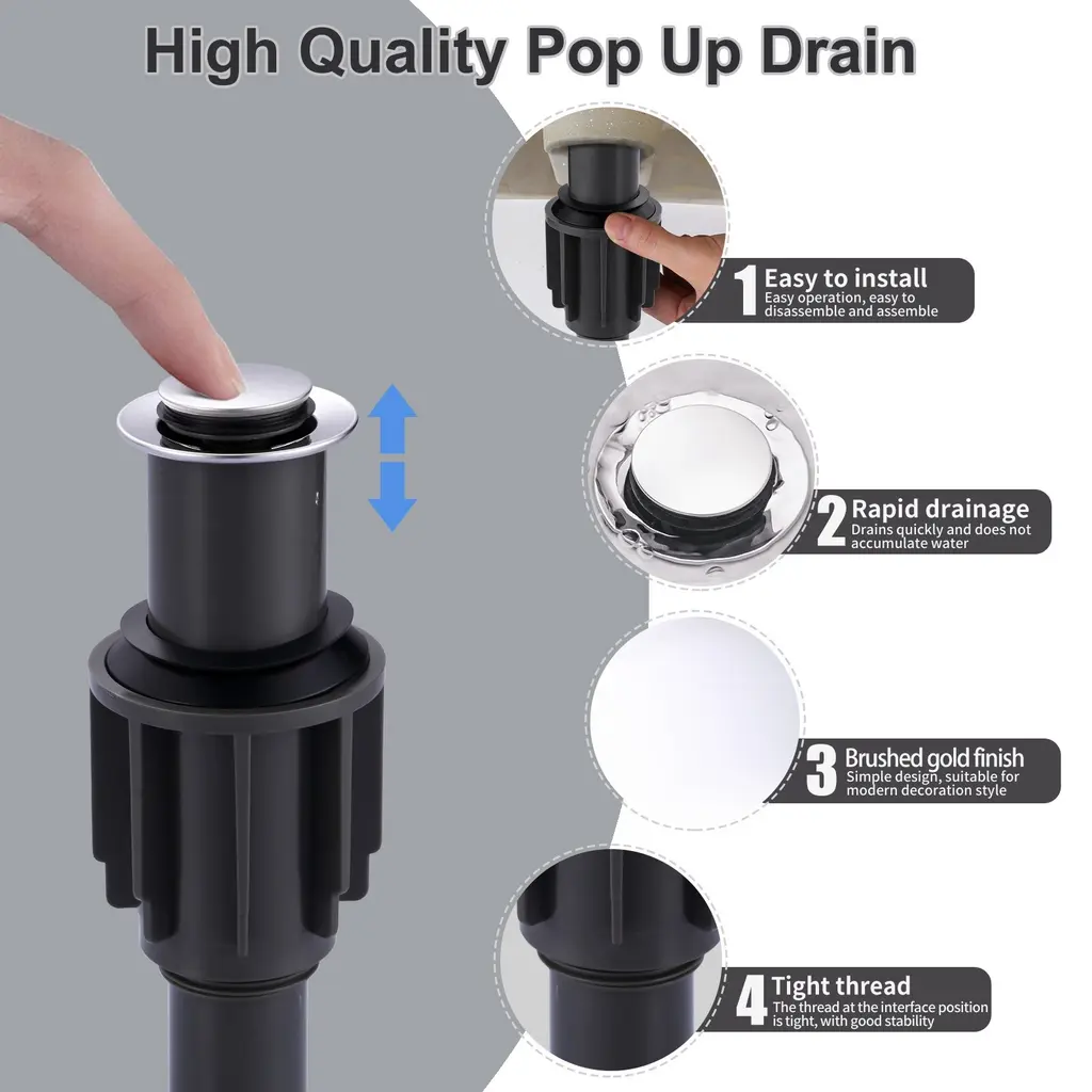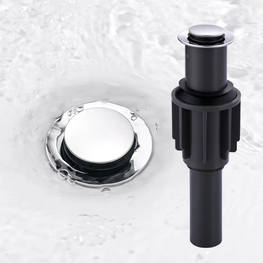This bathroom sink drain assembly is versatile and user-friendly, ideal for sinks equipped with an overflow. Its spring-loaded push-button design allows effortless sealing and opening with a simple press. Crafted from durable ABS material, it ensures longevity and reliable performance over time. Featuring multi-layer leakage prevention with high-quality silicone gaskets, it securely fits vessel, basin and undermount sinks, effectively preventing water leakage without the need for adhesive. Installation is quick and straightforward with detailed instructions provided, ensuring a hassle-free setup process.Highlights