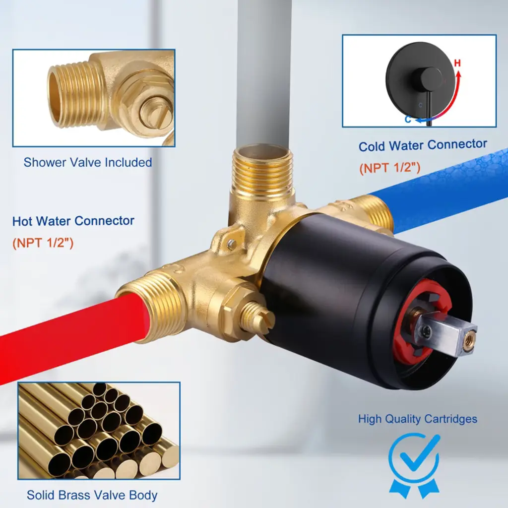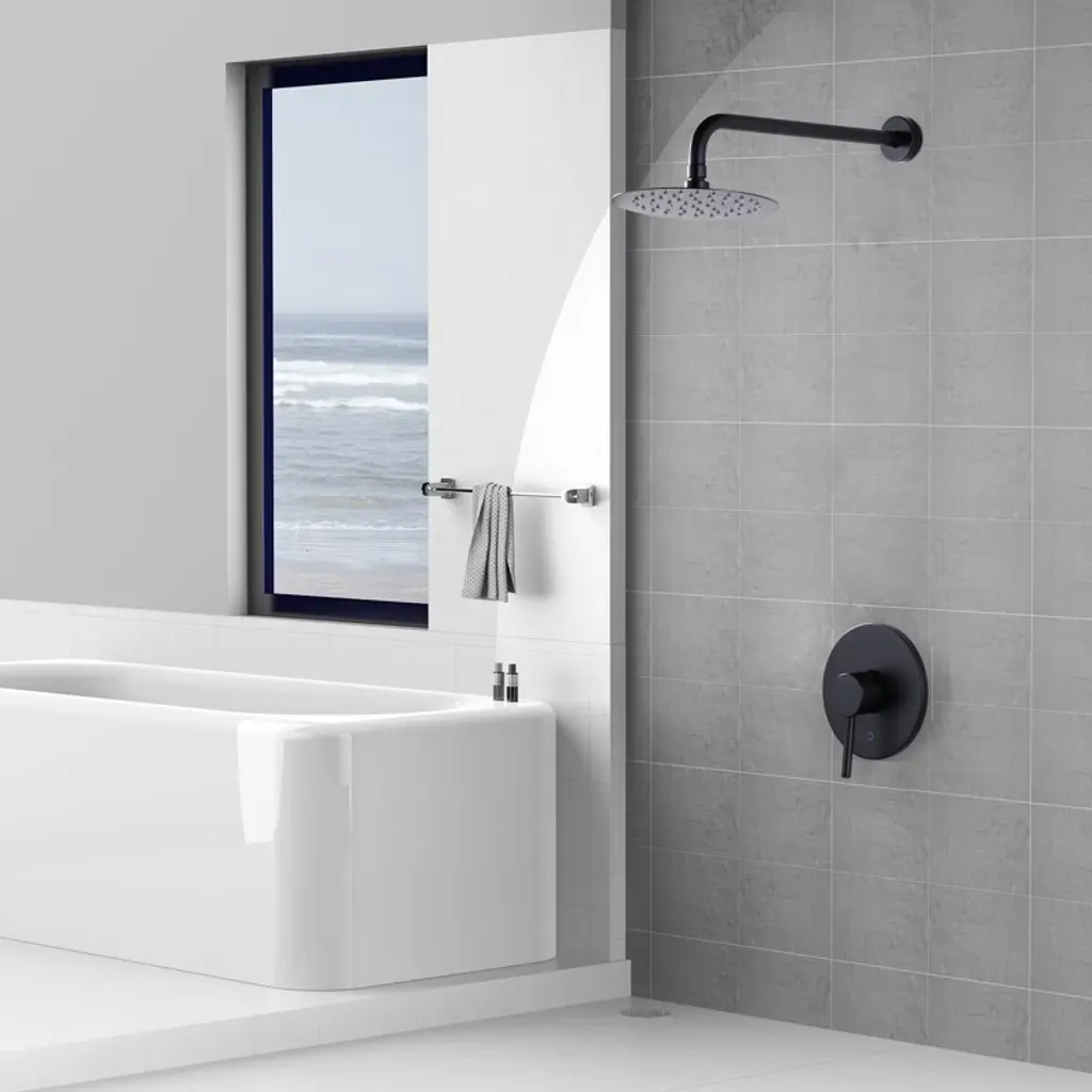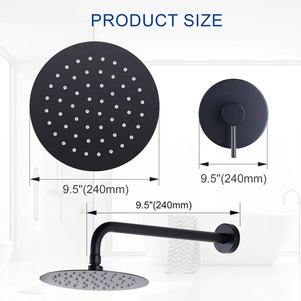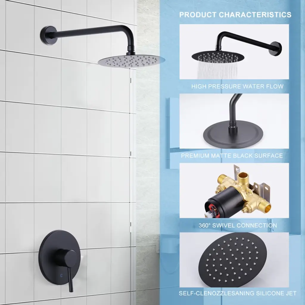 This shower set combines wall mounted overhead shower, single handle control and 5-shower modes in one. The simple single handle design allows for complete and easy control of both water flow and temperature while maintain the fine minimalist aesthetic to match with any modern or contemporary decor style. Simple design and high-end experience, easy to adjust the water temperature and water flow, save bathroom space, meet different bathing needs, so that every shower becomes a pleasure, refreshing the bathroom with a new style.