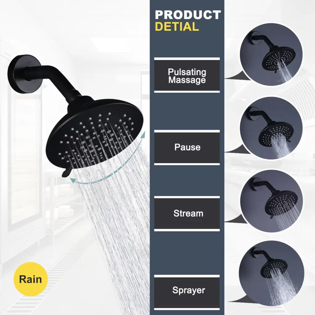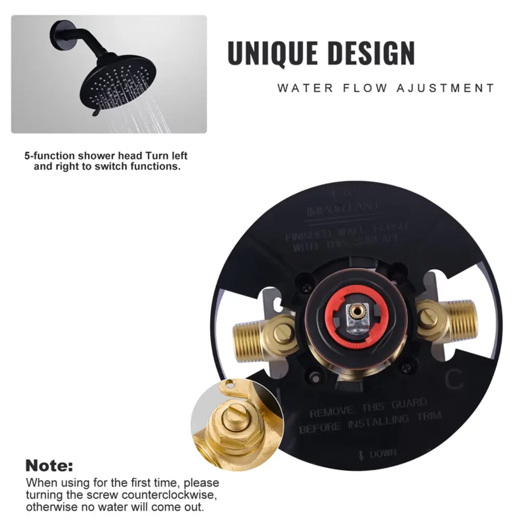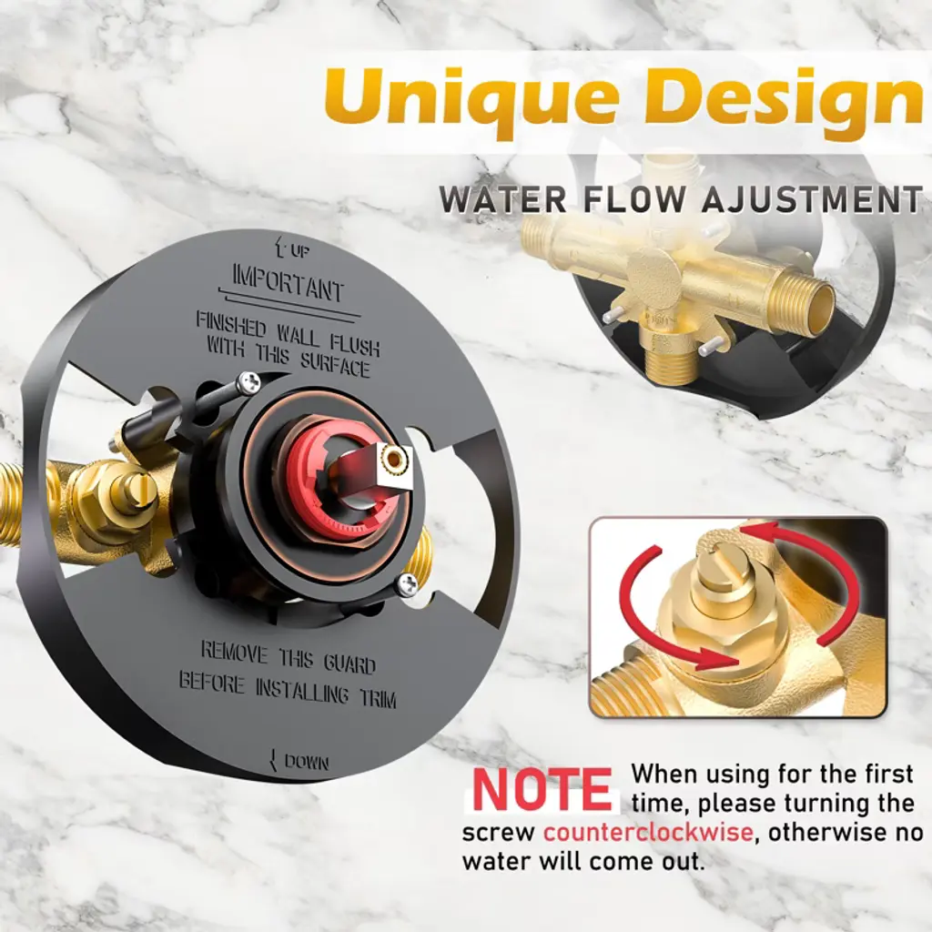 Experience the epitome of luxury and functionality with our Single-Handle 5-Spray Shower Faucet. Made from high quality solid brass, this shower faucet is built to last, resisting corrosion and wear for years of reliable use. The 304 stainless steel cover adds an extra layer of durability. Single handle design, with its modern semi-industrial aesthetic, simplifies temperature adjustment. A simple 90° turn of the handle allows you to easily switch between cold and hot water. With five different spray options, you can customize your shower to suit your mood, whether you prefer a soft rainfall or a invigorating massage. Cleaning is a breeze as the soft silicone nozzles can be easily wiped clean of limescale buildup. The pressure balance valve maintains consistent water pressure and temperature, protecting users from sudden temperature fluctuations that could cause scalding. Upgrade your bathroom with this versatile and reliable shower faucet.