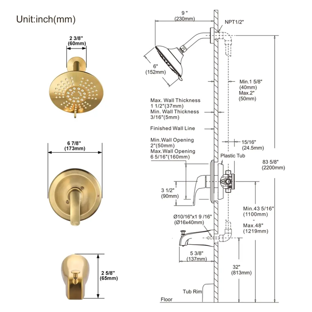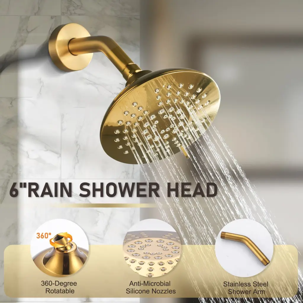 The sleek and modern design of this shower faucet makes it an ideal choice for contemporary bathrooms, enhancing the overall aesthetic appeal of the space. Crafted from high quality materials, the solid brass body and stainless-steel shower arm ensure exceptional durability and corrosion resistance, guaranteeing years of reliable performance. The single handle operation makes it easy to control the water flow and temperature, providing you with a convenient experience. 6-inch diameter shower head features 5 spray settings, offering a variety of options ranging from a gentle, rain-like flow to a powerful massage spray, catering to your diverse showering preferences. The included tub spout with a convenient diverter allows for effortless switching between filling your tub and enjoying a shower. Upgrade your bathroom with our Single Handle 5-Spray Shower Faucet with Tub Spout.